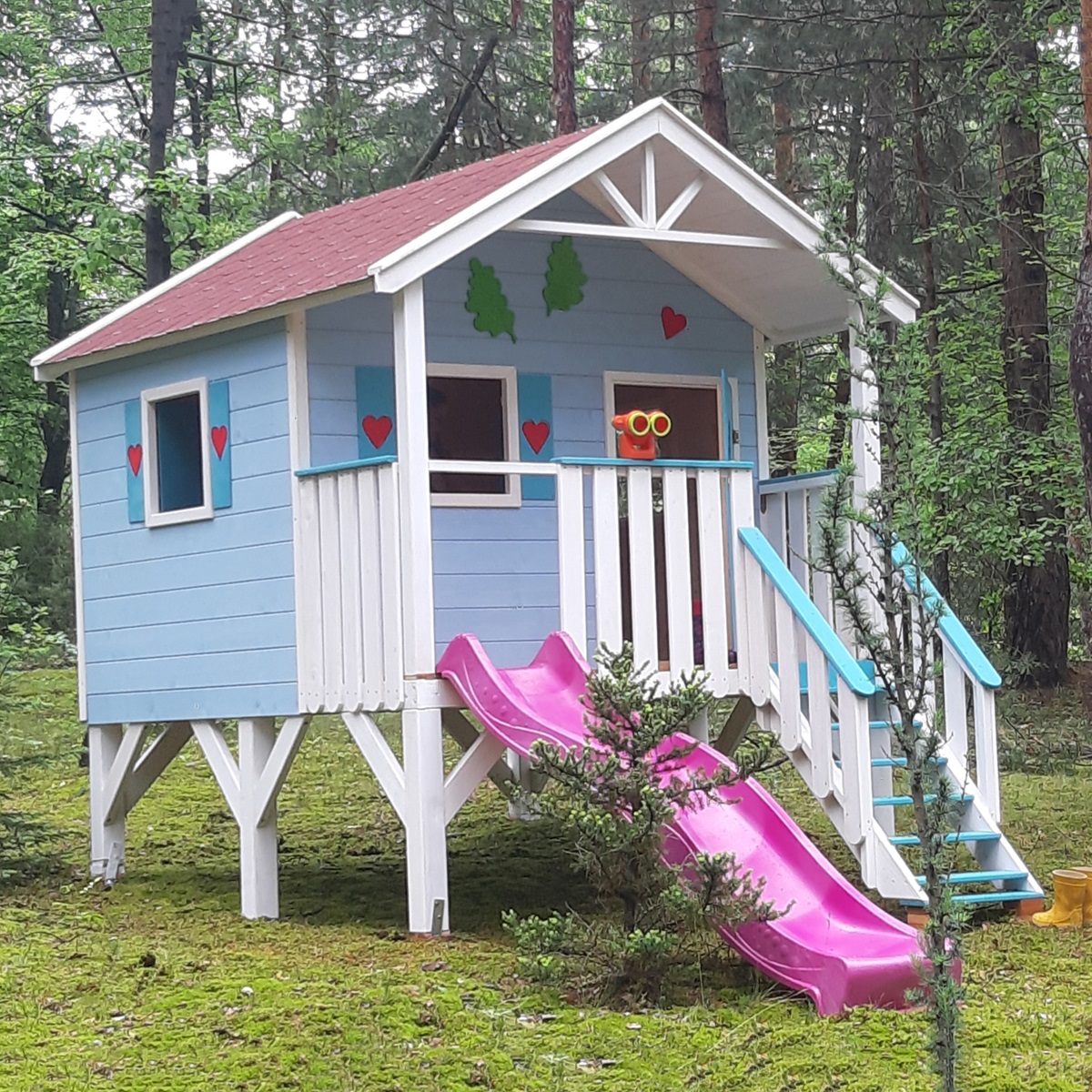 Barevné varianty: Vyberte si z široké palety barevných kombinací, jako je bílo-modrá, bílo-růžová, šedo-bílá, bílo-zelená, kaštan a mnoho dalších, aby hřiště dokonale ladilo s vaší zahradou. Dům je lakován libovolnou barvou z palety RAL.