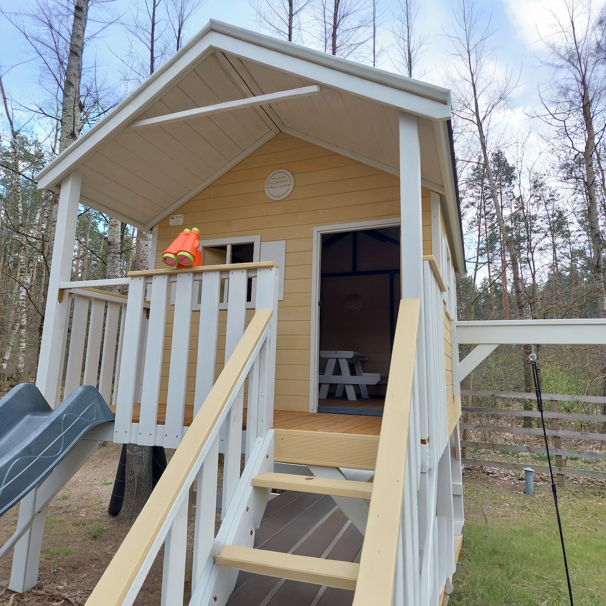 Vnější části domku jsou impregnovány, zatímco podlahy jsou napuštěny prostředkem v barvě dubu pro zvýšenou odolnost a estetiku.
