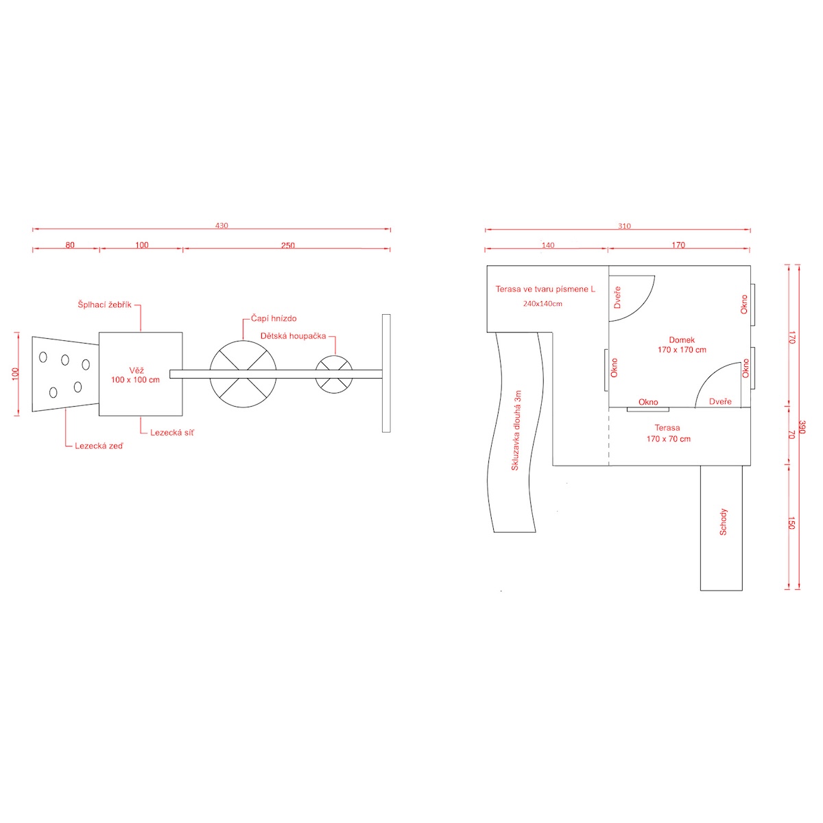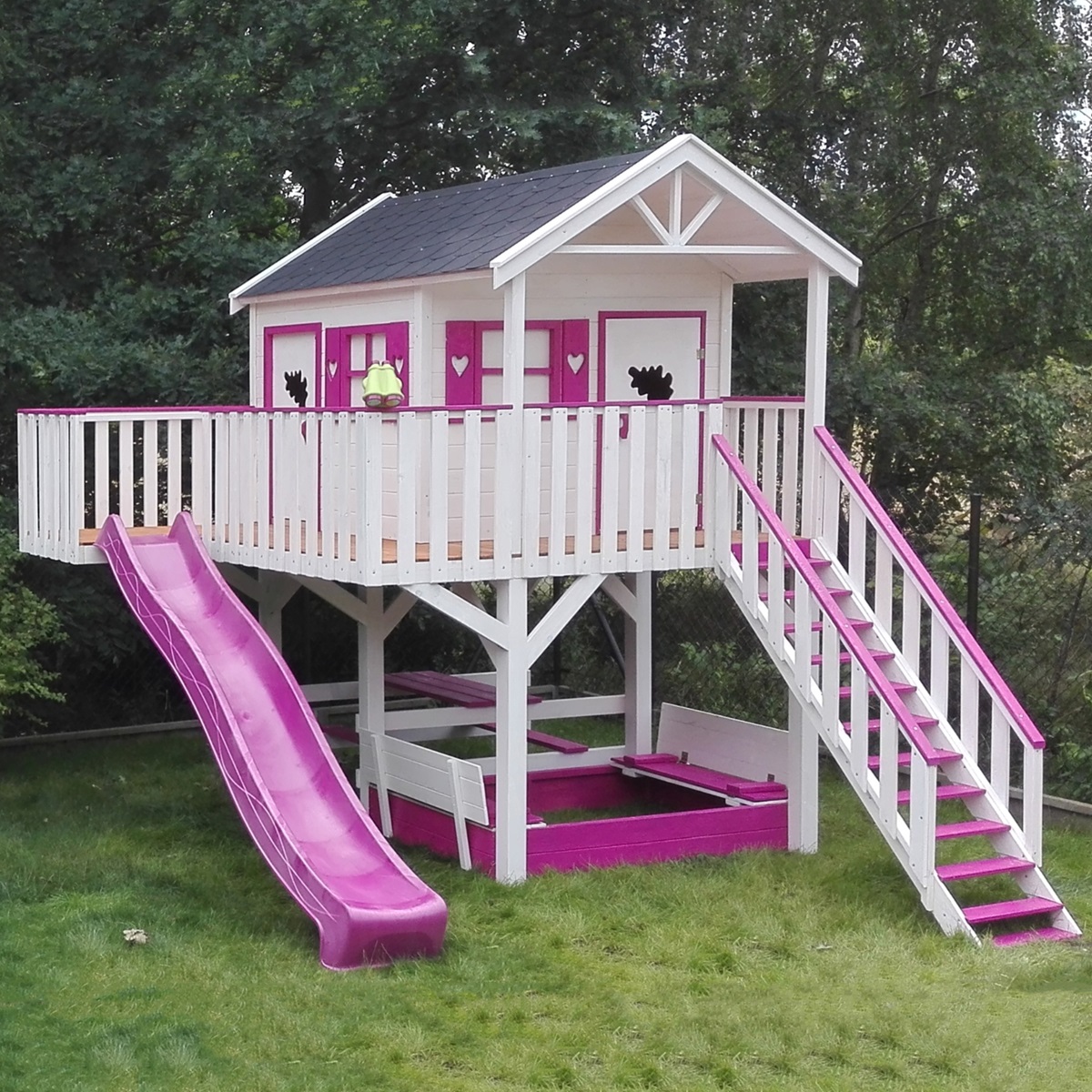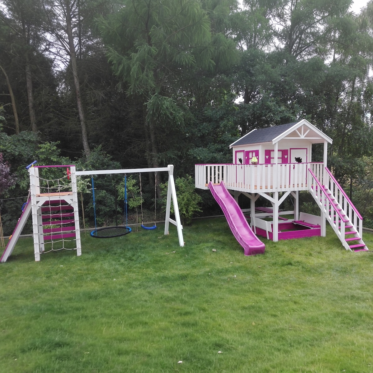 Hřiště – FUCHSIE nabízí širokou škálu barevných kombinací, jako je bílo-modrá, bílo-růžová, bílo-černá, šedo-bílá, bílo-šedá, bílo-zelená, bílo-žlutá, kaštan a transparentní lazura, které umožňují přizpůsobení vašemu vkusu. Dále je možné hřiště vybavit osvětlením nebo přidat dřevěnou cedulku s vygravírovaným textem či obrázkem. Pro ještě větší originalitu si můžete vybrat z různých výřezů do okenic a dveří, například list, srdíčko nebo princezna. Střecha může být pokryta bitumenovým šindelem v barvách červená, hnědá, zelená nebo černá. Nabízíme také profesionální montáž po celé republice a dopravu po celé ČR a SR, včetně detailního návodu k instalaci. Při objednávce montáže na fyzickou nepodnikající osobu jako příslušenství rodinného domu je možné uplatnit sníženou sazbu DPH 12%.