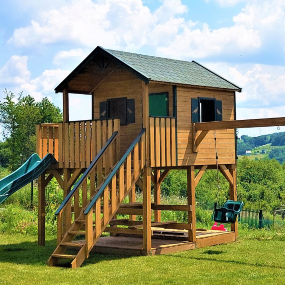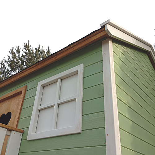 Hřiště je vyrobeno z borovicového masivního dřeva, stěny, podlaha a střecha z 15 mm desek spojovaných na pero a drážku. Okna a dveře jsou z lehké, voděodolné překližky z tvrdého dřeva.