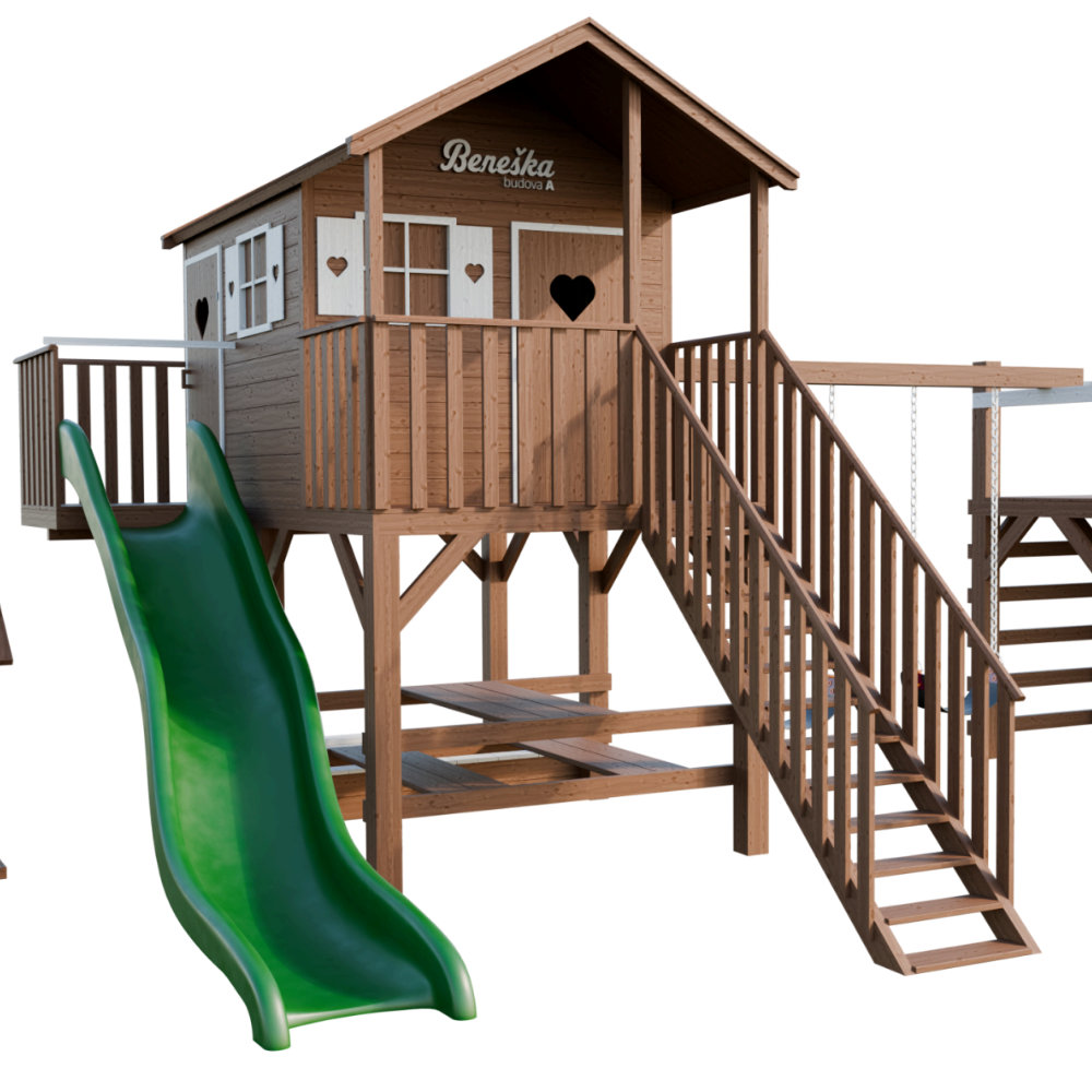 Hřiště lze přizpůsobit výběrem barvy, barvy 3m skluzavky, barvy střešního šindele, přidáním osvětlení, dřevěné cedulky s nápisem a vyřezanými motivy do okenic a dveří (List, Srdíčko, Princezna).
