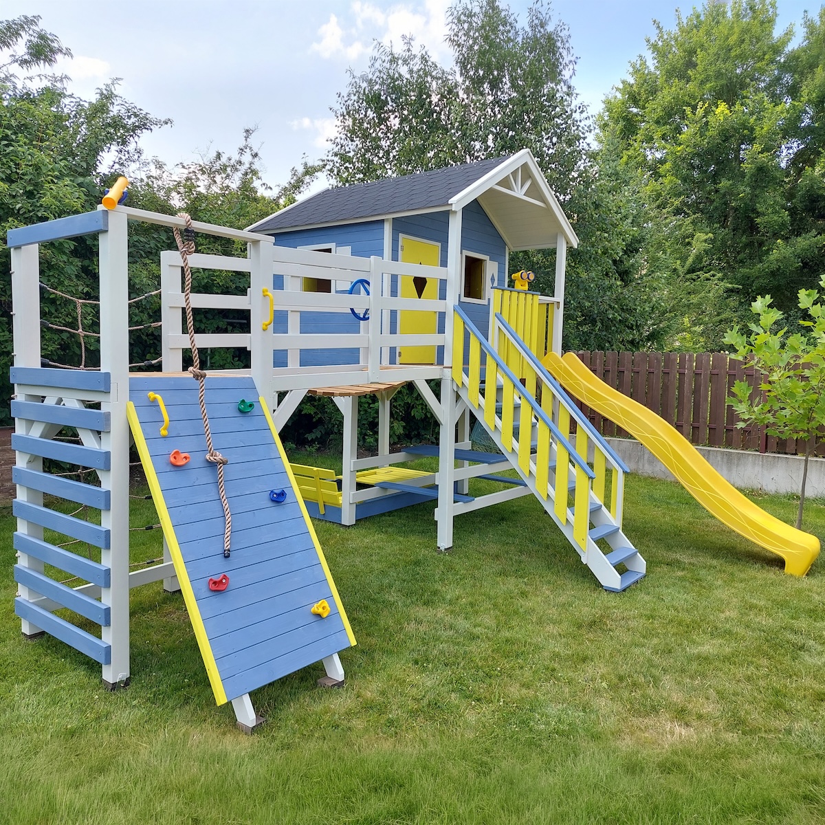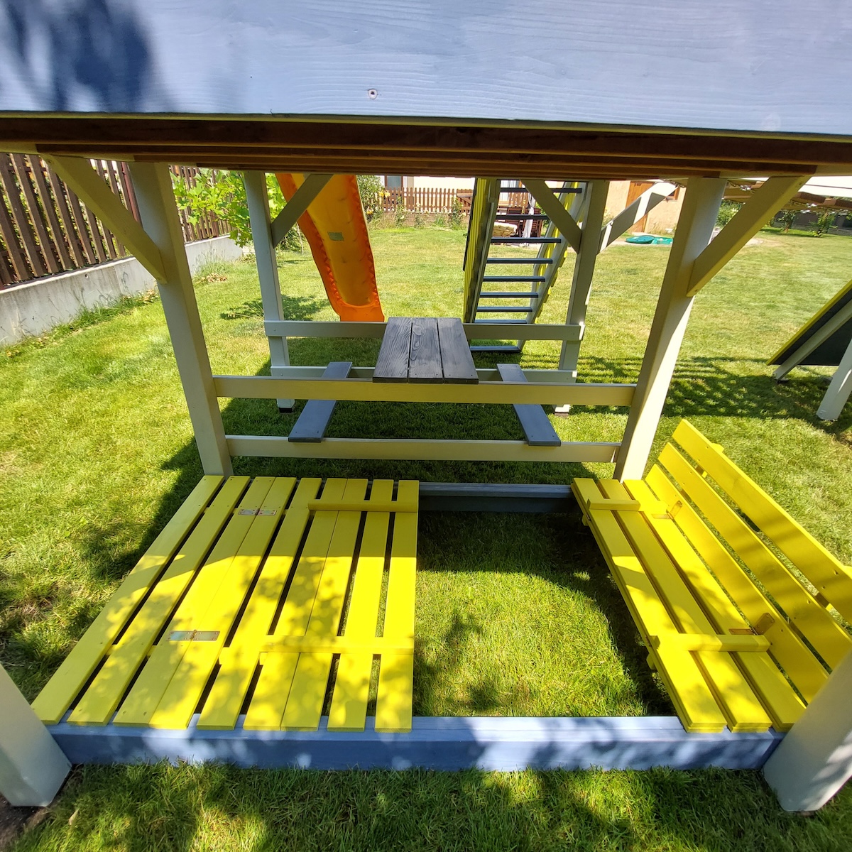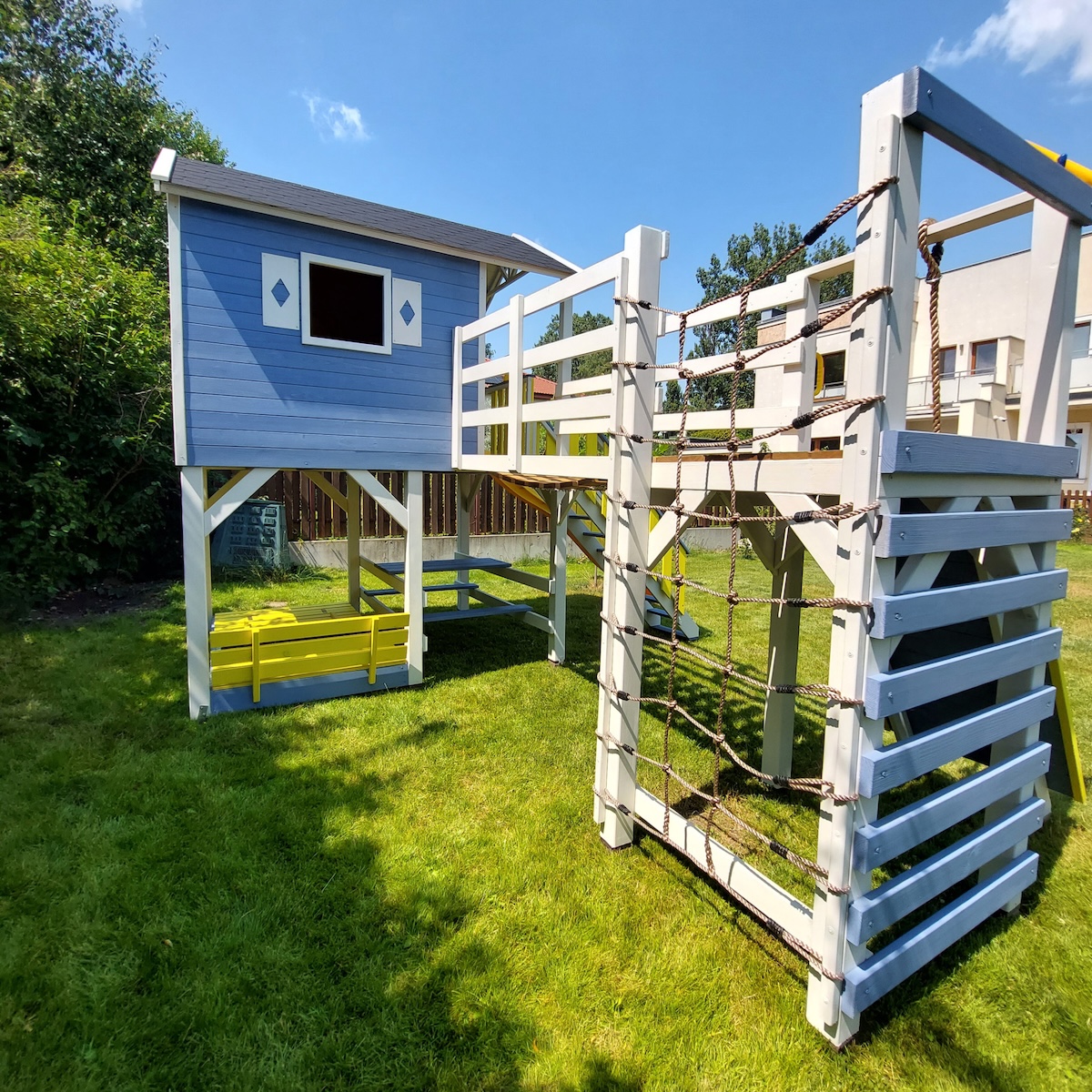 Barva dětského hřiště: Vyberte si z mnoha unikátních barevných kombinací, jako jsou Bílo-modrá, Bílo-růžová, Bílo-černá, Šedo-bílá, Bílo-šedá, Bílo-zelená, Bílo-žlutá, Kaštan nebo Transparentní lazura.
