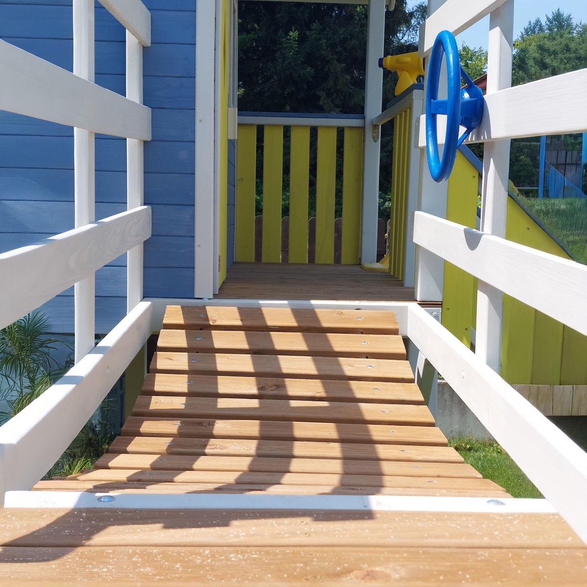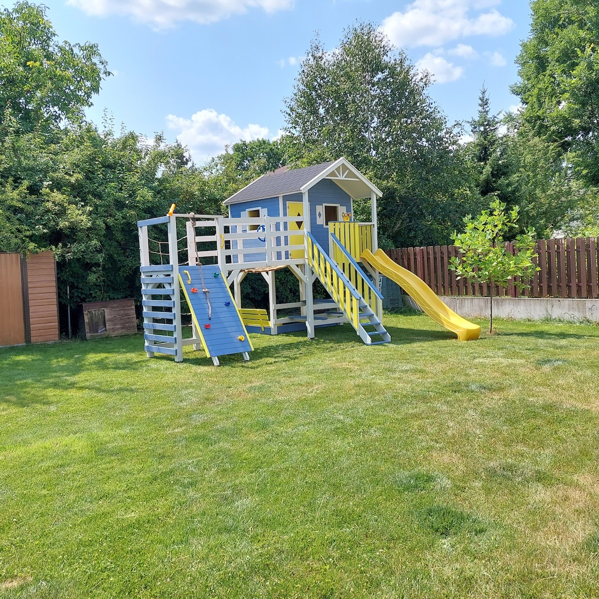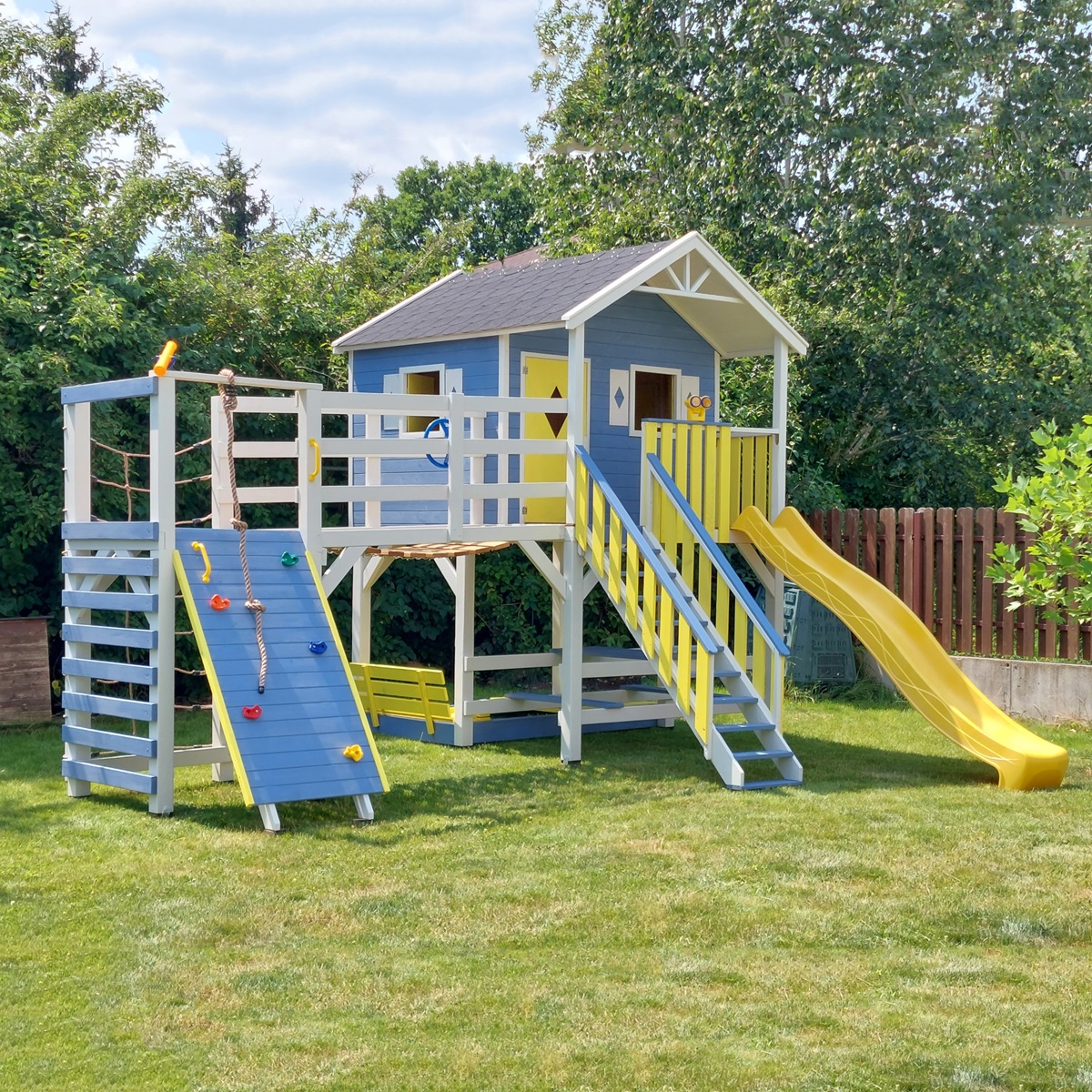 Barva dětského hřiště: Vyberte si z mnoha unikátních barevných kombinací, jako jsou Bílo-modrá, Bílo-růžová, Bílo-černá, Šedo-bílá, Bílo-šedá, Bílo-zelená, Bílo-žlutá, Kaštan nebo Transparentní lazura.