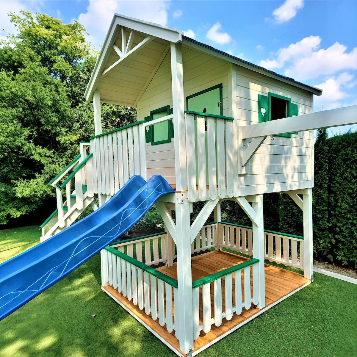 2. Je možné si hřiště přizpůsobit a jaké jsou možnosti?Ano, hřiště nabízí široké možnosti přizpůsobení. Můžete si vybrat z různých barevných kombinací, přidat osvětlení, personalizovanou dřevěnou cedulku, vybrat výřezy do okenic a dveří (List, Srdíčko, Princezna) a zvolit barvu bitumenového šindele na střeše (červená, hnědá, zelená, černá).