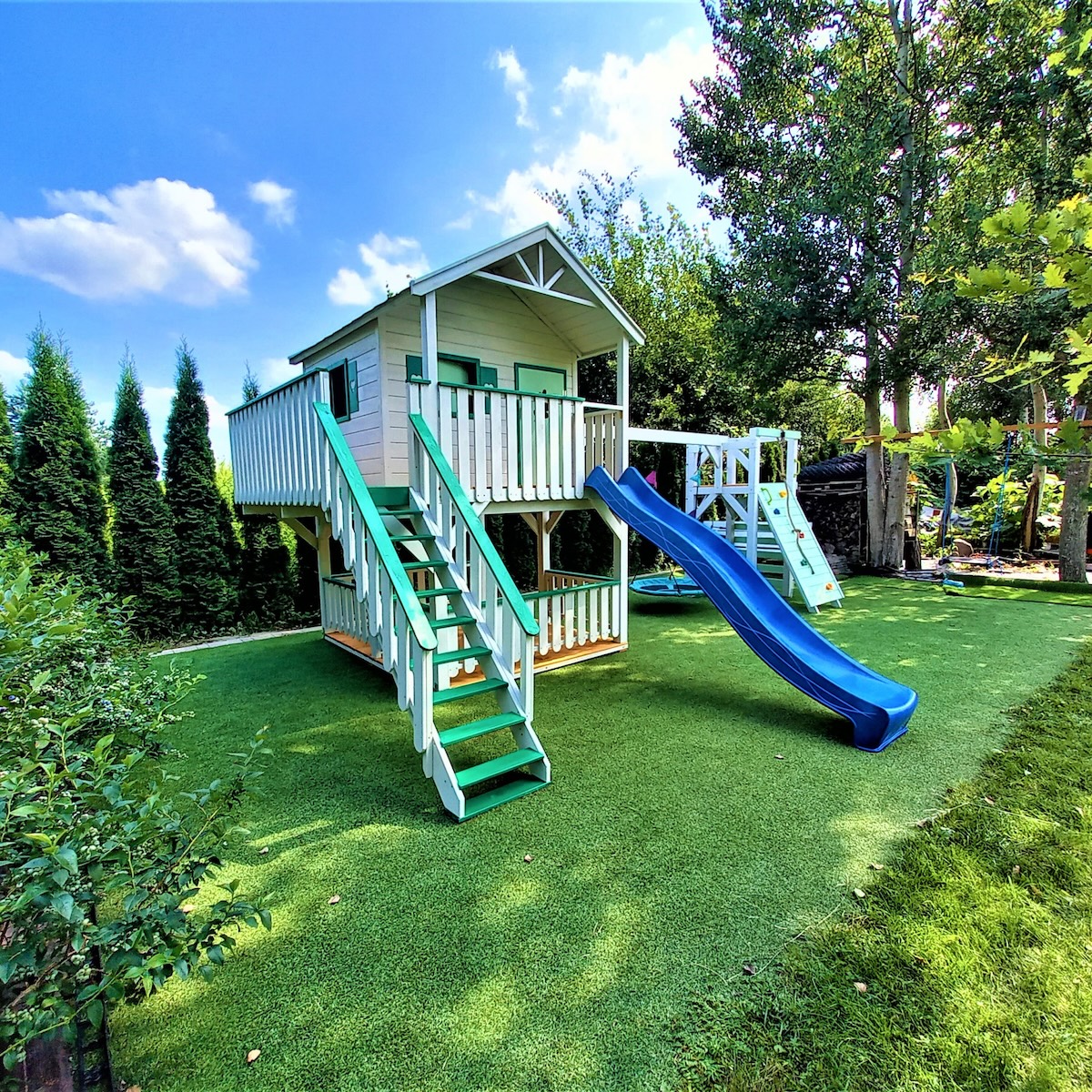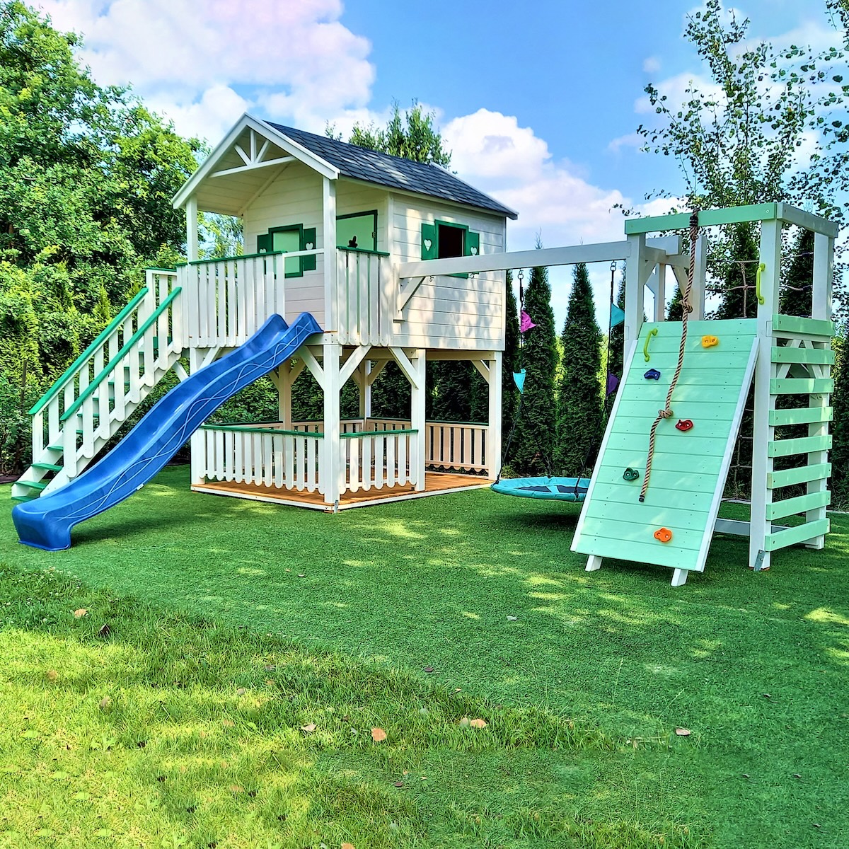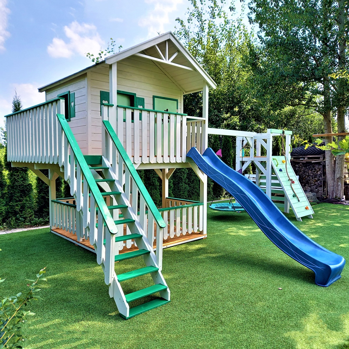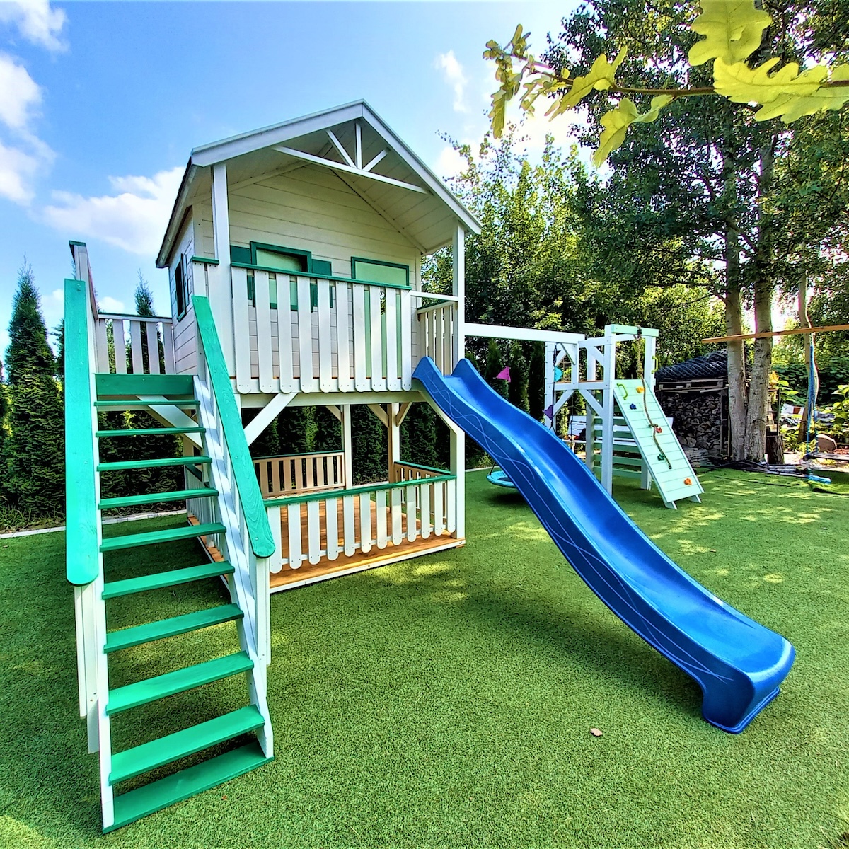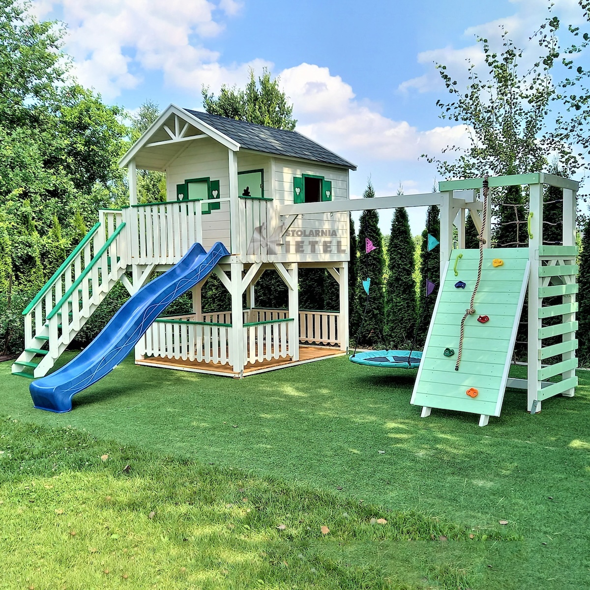 1. Z jakého materiálu je hřiště vyrobeno a je ošetřeno proti povětrnostním vlivům?Hřiště je vyrobeno z borovicového masivního dřeva. Exteriér domu je impregnován a všechny podlahy jsou napuštěny prostředkem v barvě dubu, což zajišťuje jejich odolnost a estetiku.