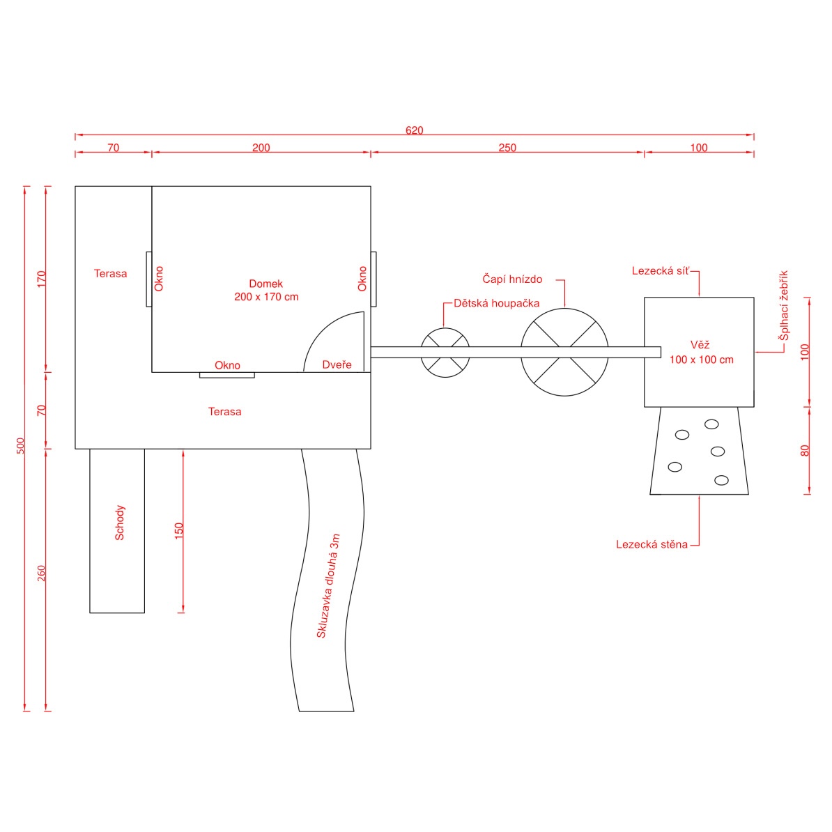 Konstrukce hřiště MÁTA je navržena s důrazem na bezpečnost a dlouhou životnost. Všechny prvky jsou vyrobeny z borovicového masivního dřeva, které je známé svou odolností. Dům a věž stojí na vertikálních sloupkách o rozměrech 10 x 10 cm, doplněných vodorovnými nosníky a výztuhami 4 x 10 cm pro maximální tuhost. Stěny, podlaha a střecha jsou z 15 mm obkladových desek, spojovaných systémem pero-drážka, což zajišťuje pevnost a stabilitu. Exteriér domu je impregnován a všechny podlahy jsou napuštěny prostředkem v barvě dubu pro zvýšenou odolnost a estetický vzhled.