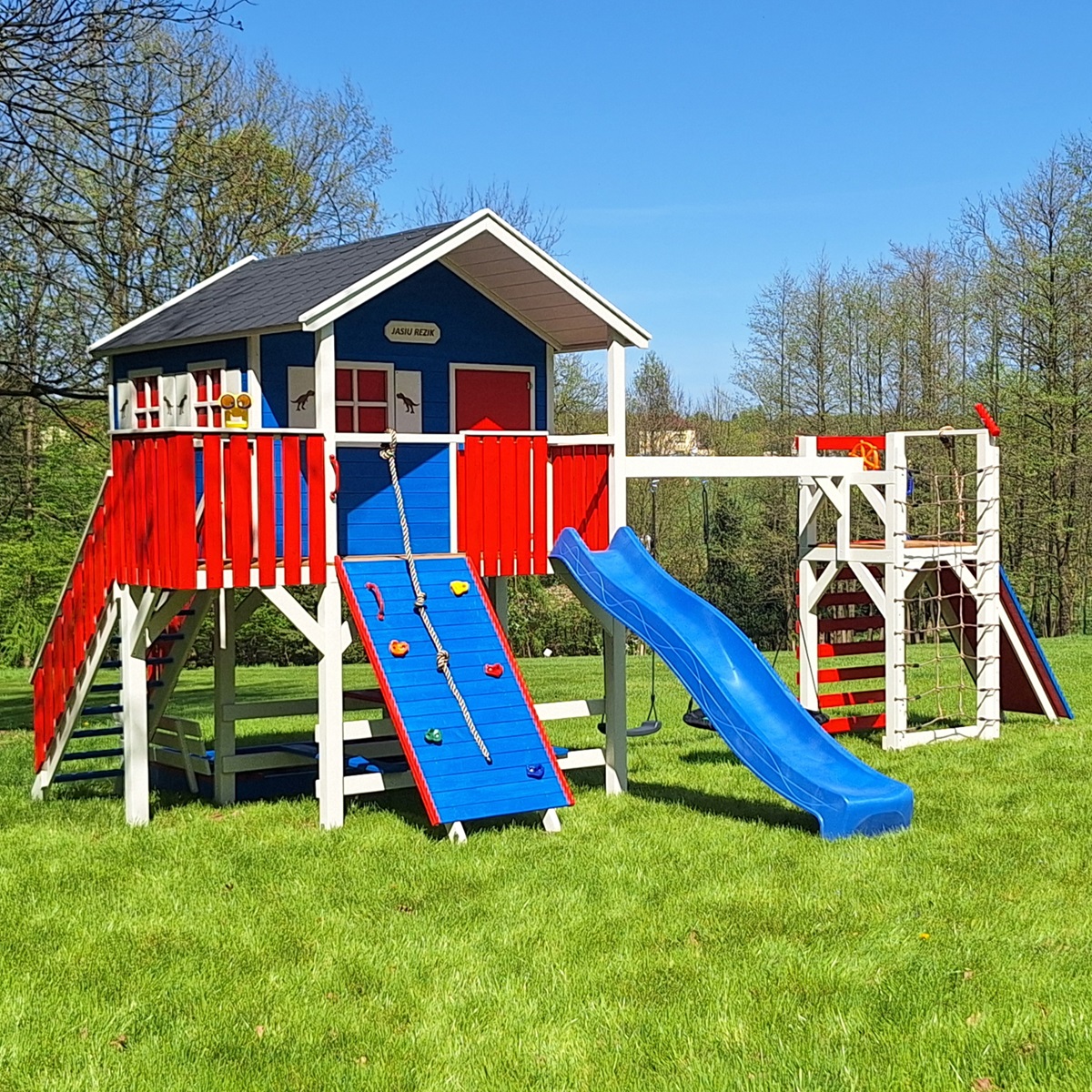 Z jakého materiálu je hřiště vyrobeno a jak je ošetřeno?Hřiště je vyrobeno z borovicového masivního dřeva. Dům je zvenku impregnován a všechny podlahy jsou napuštěny prostředkem v barvě dubu pro zvýšení odolnosti a estetiky.