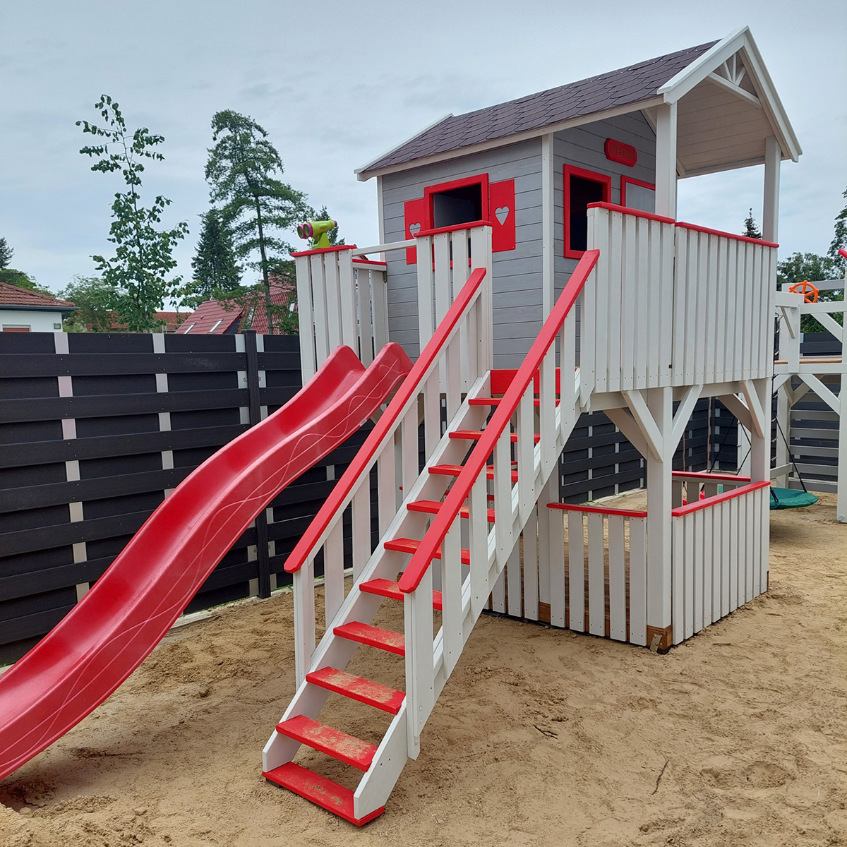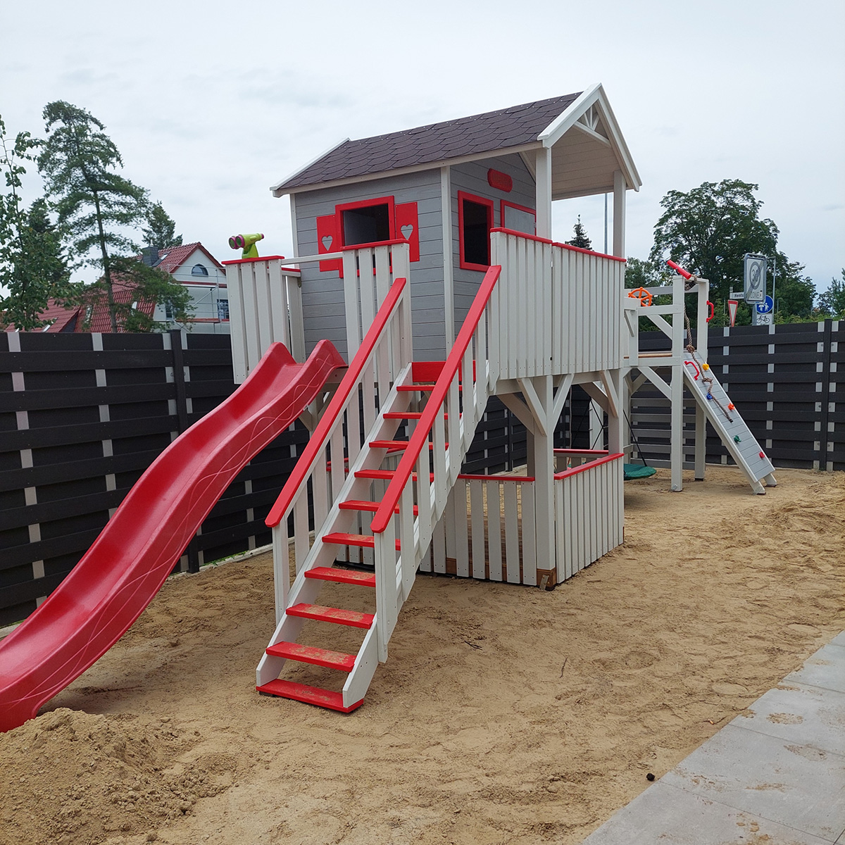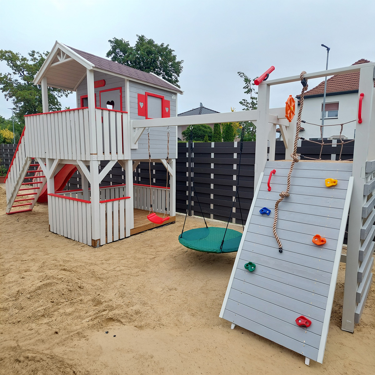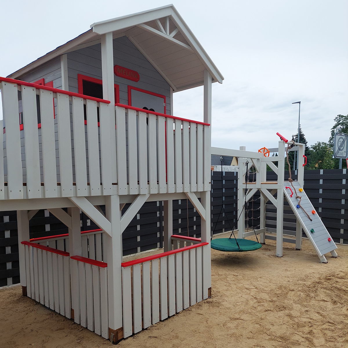 Hřiště je vyrobeno z borovicového masivního dřeva. Dům je zvenku impregnován a všechny podlahy jsou napuštěny prostředkem v barvě dubu, což zajišťuje jejich odolnost a estetiku.