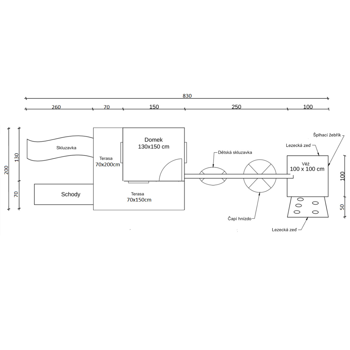 Výška plošiny domu a věže je 150 cm.