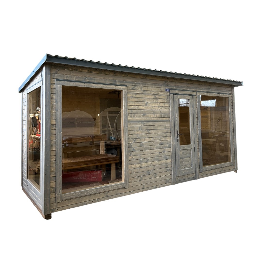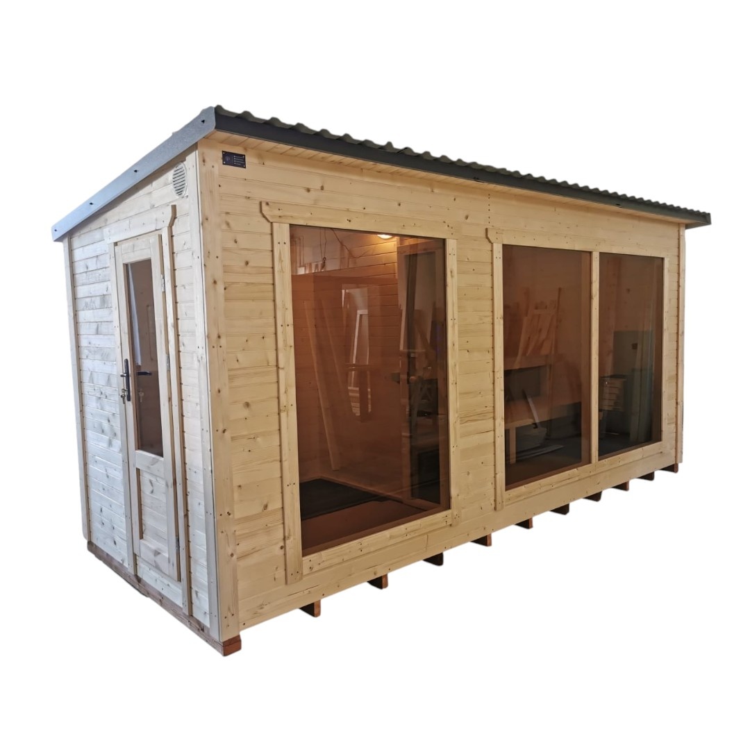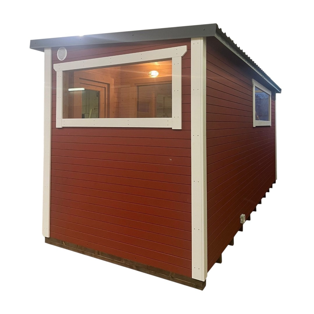Topení není součástí standardní výbavy – na výběr jsou kamna na tuhá paliva nebo elektrická kamna značky HARVIA a HUUM. Okna lze doplnit na přání. Zakázkové barvy střechy či lakování jsou k dispozici za příplatek.