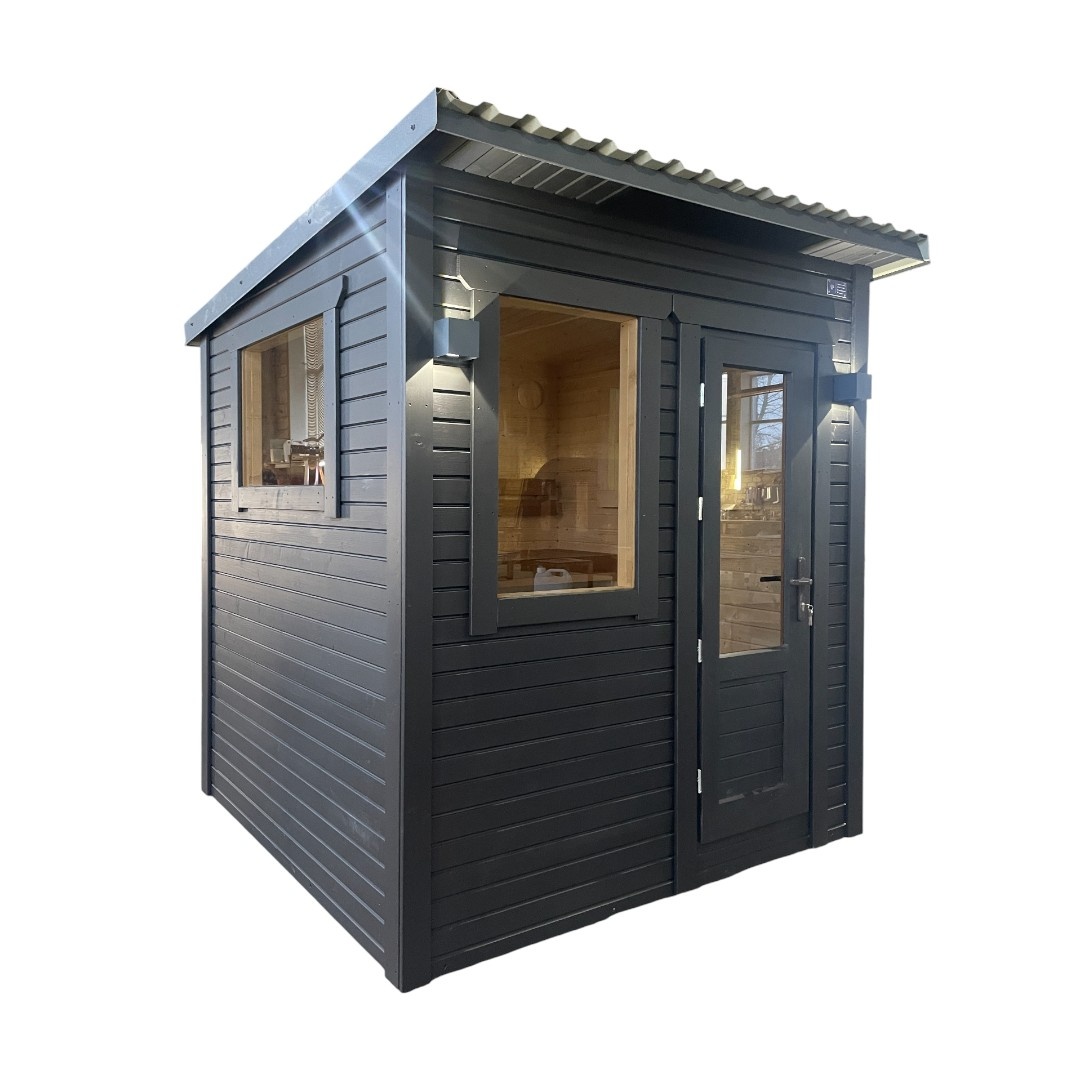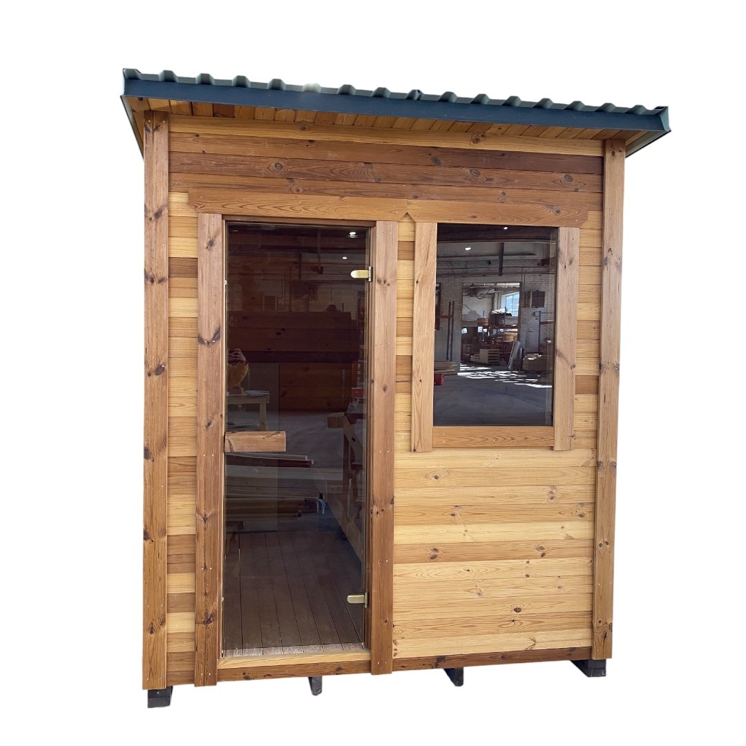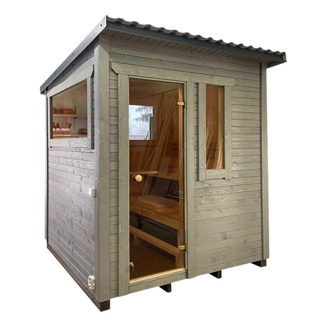 Ručně vyráběná sauna M Box ze smrkového dřeva je plně smontovaná, připravená k okamžitému použití a představuje ideální kombinaci přírodního vzhledu, funkčnosti a moderního designu. Je navržena tak, aby se rychle vyhřála, dlouho udržela teplo a poskytla maximální pohodlí při každém saunování. Sauna je ideální pro malé zahrady nebo omezený prostor. Nabízí vynikající tepelnou izolaci a pohodlí pro 1–2 osoby v moderním, minimalistickém designu s plochou střechou.
