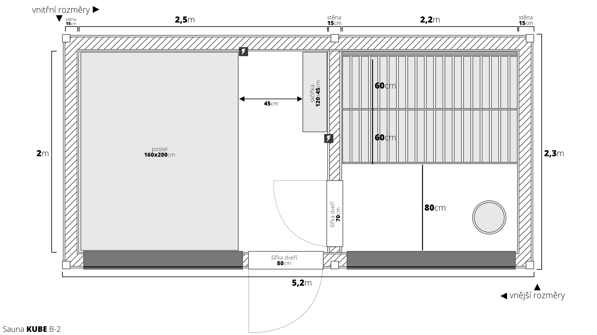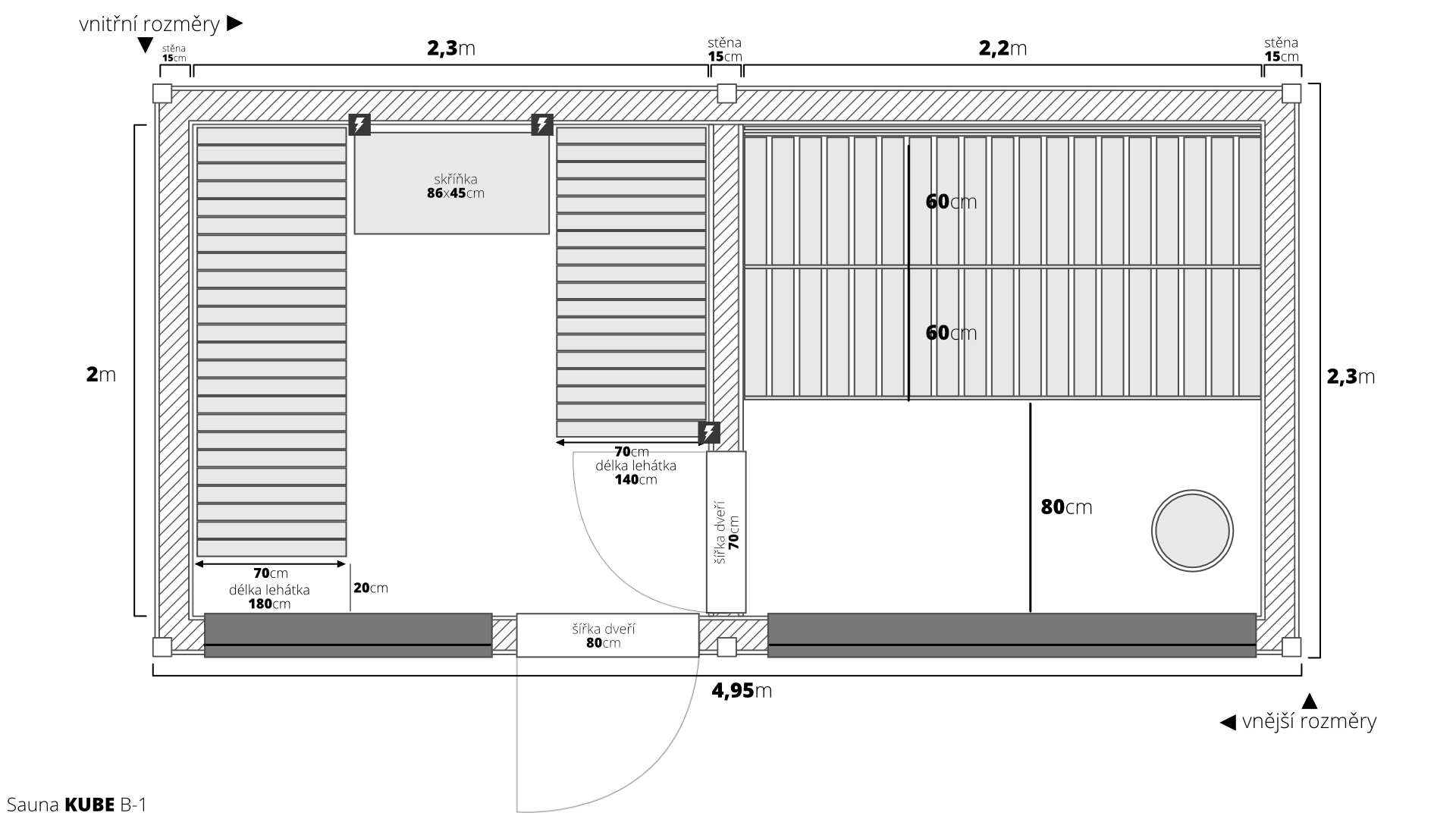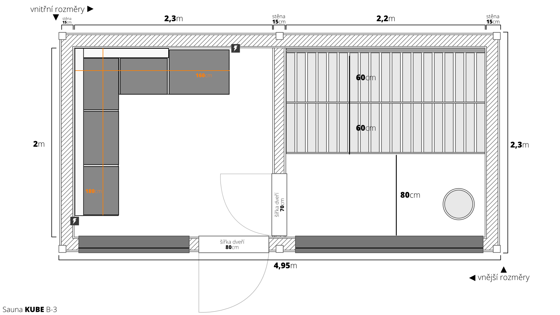 Vstupte do světa nekonečných možností s naší dřevěnou saunou MODERN KUBE – PROFI s odpočívárnou. Jako výrobci vám nabízíme plnou flexibilitu v rozměrech a vybavení, abychom splnili i ty nejnáročnější požadavky. Základní výměra 4,95×2,5m je navržena pro maximální komfort dvou osob, ale finální rozměr je vždy na vás.