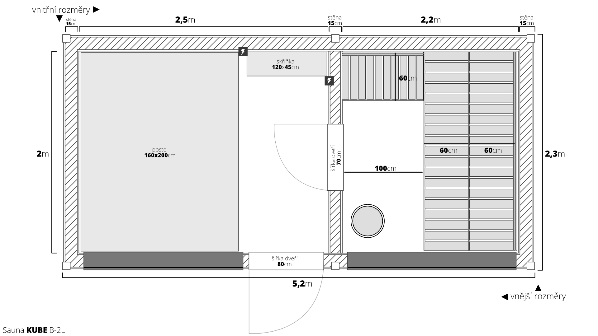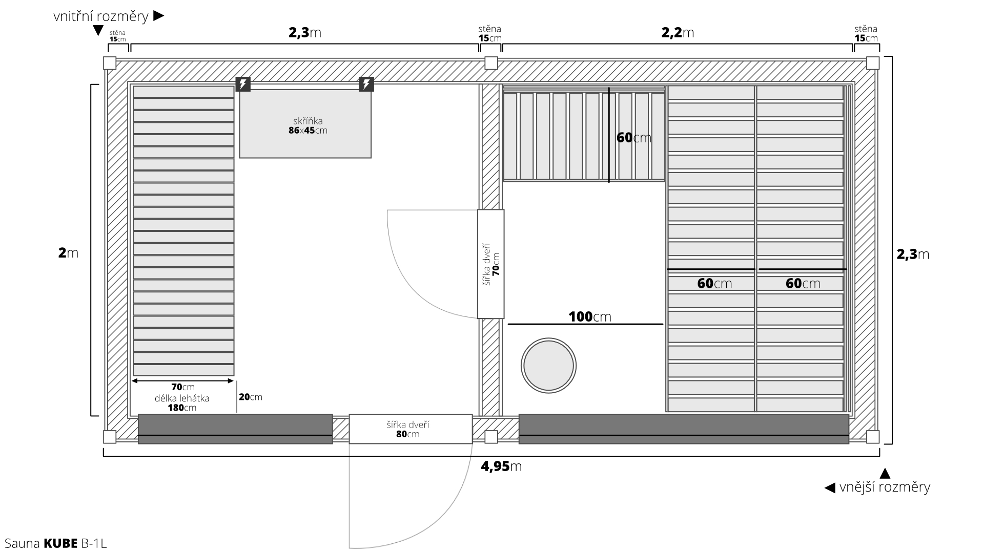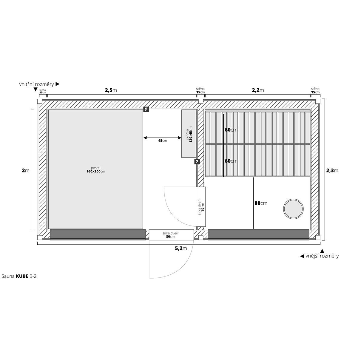 Vstupte do světa nekonečných možností s naší dřevěnou saunou MODERN KUBE – PROFI s odpočívárnou. Jako výrobci vám nabízíme plnou flexibilitu v rozměrech a vybavení, abychom splnili i ty nejnáročnější požadavky. Základní výměra 4,95×2,5m je navržena pro maximální komfort dvou osob, ale finální rozměr je vždy na vás.