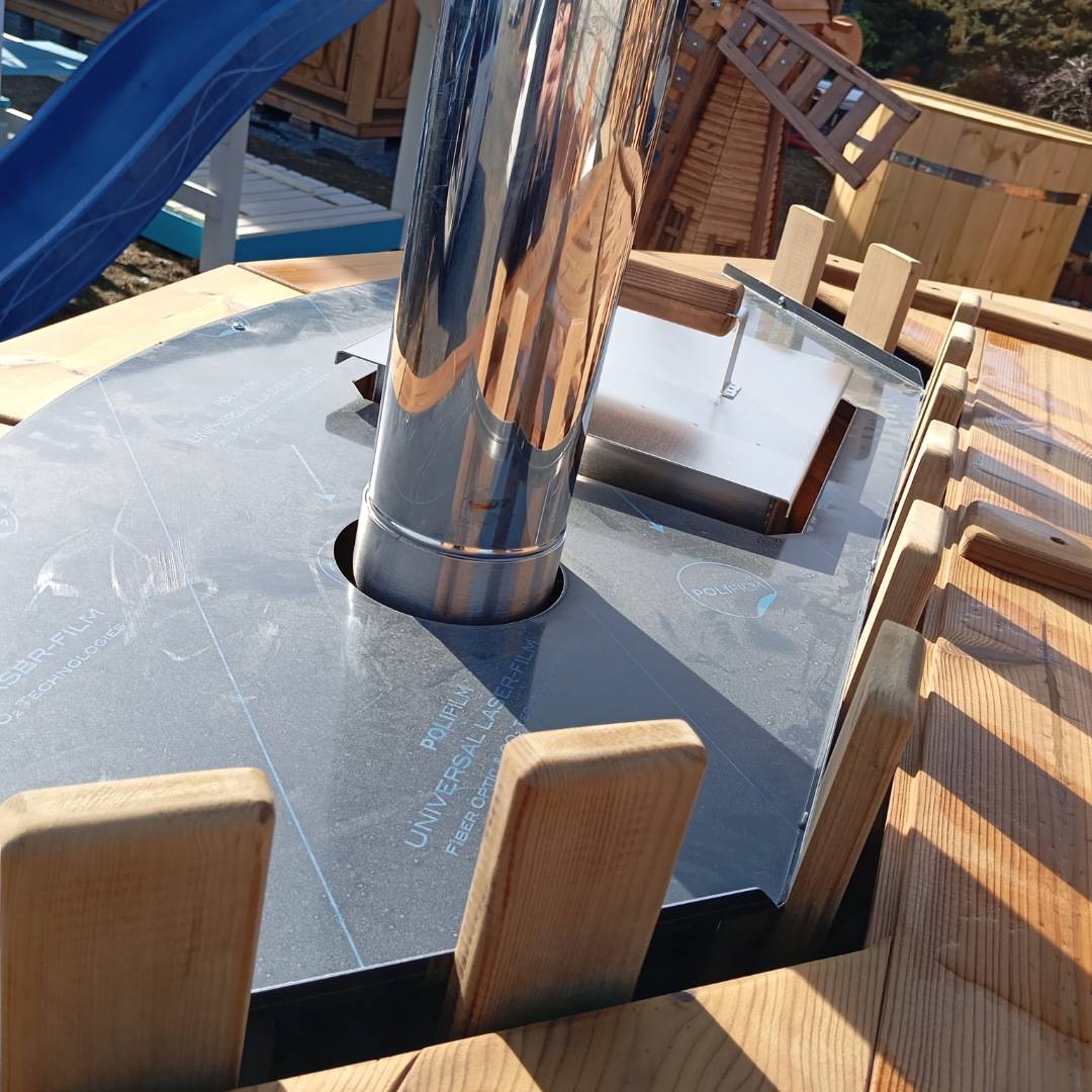 • Kompletní příslušenství: Součástí dodávky je 2m vysoký komín pro interní topení, výbava pro čištění topeniště, teploměr, praktický držák nápojů, míchací pádlo a elegantní dřevěný kryt ve stejném provedení jako vířivka.