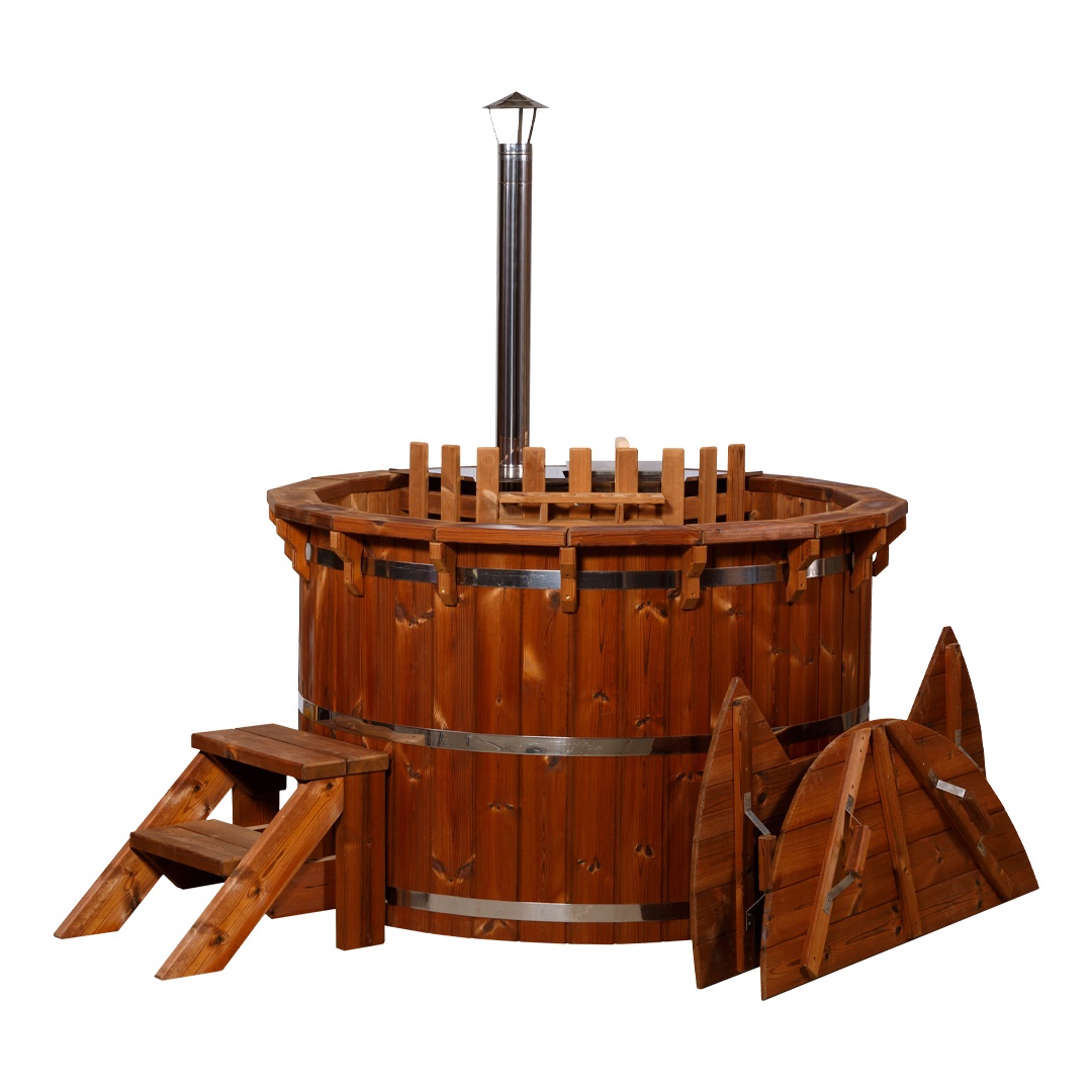 Součástí je interní topení s 2m vysokým komínem, výbava pro čištění topeniště, teploměr, držák nápojů, míchací pádlo, dřevěný kryt vířivky a standardní schůdky.