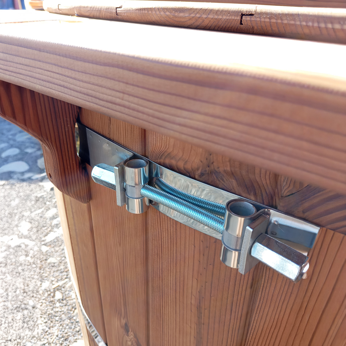 - Odolná konstrukce: Zpevnění dvěma nerezovými pásy garantuje stabilitu a dlouhou životnost celé konstrukce.