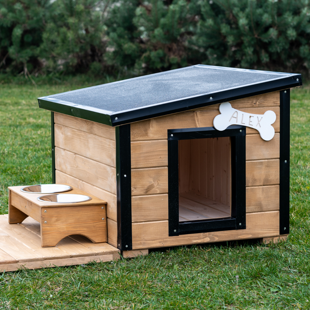 Stojan s miskami: Praktický doplněk, který umožní udržovat věci uklizené. Dokonale se hodí k psí boudě. Malý stojan se hodí k malé a středně velké psí boudě. Velký stojan zase k velkým a velmi velkým boudám.