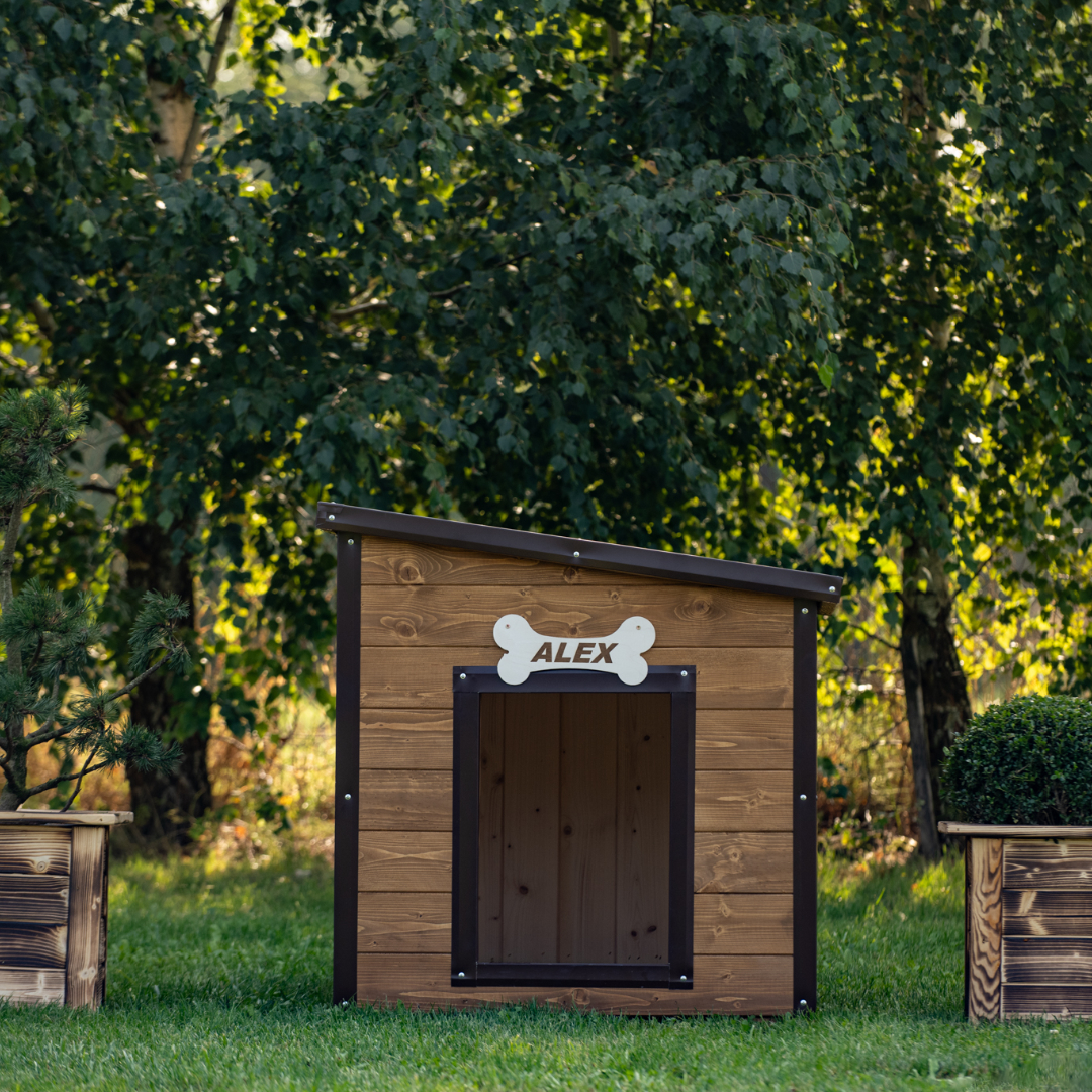 Dřevěná kost se jménem: Vyrobena z masivního dřeva, hladká nebo s vyrytým jménem Vašeho mazlíčka. Montuje se na boční stěnu psí boudy, nebo je připravena k vlastní montáži.