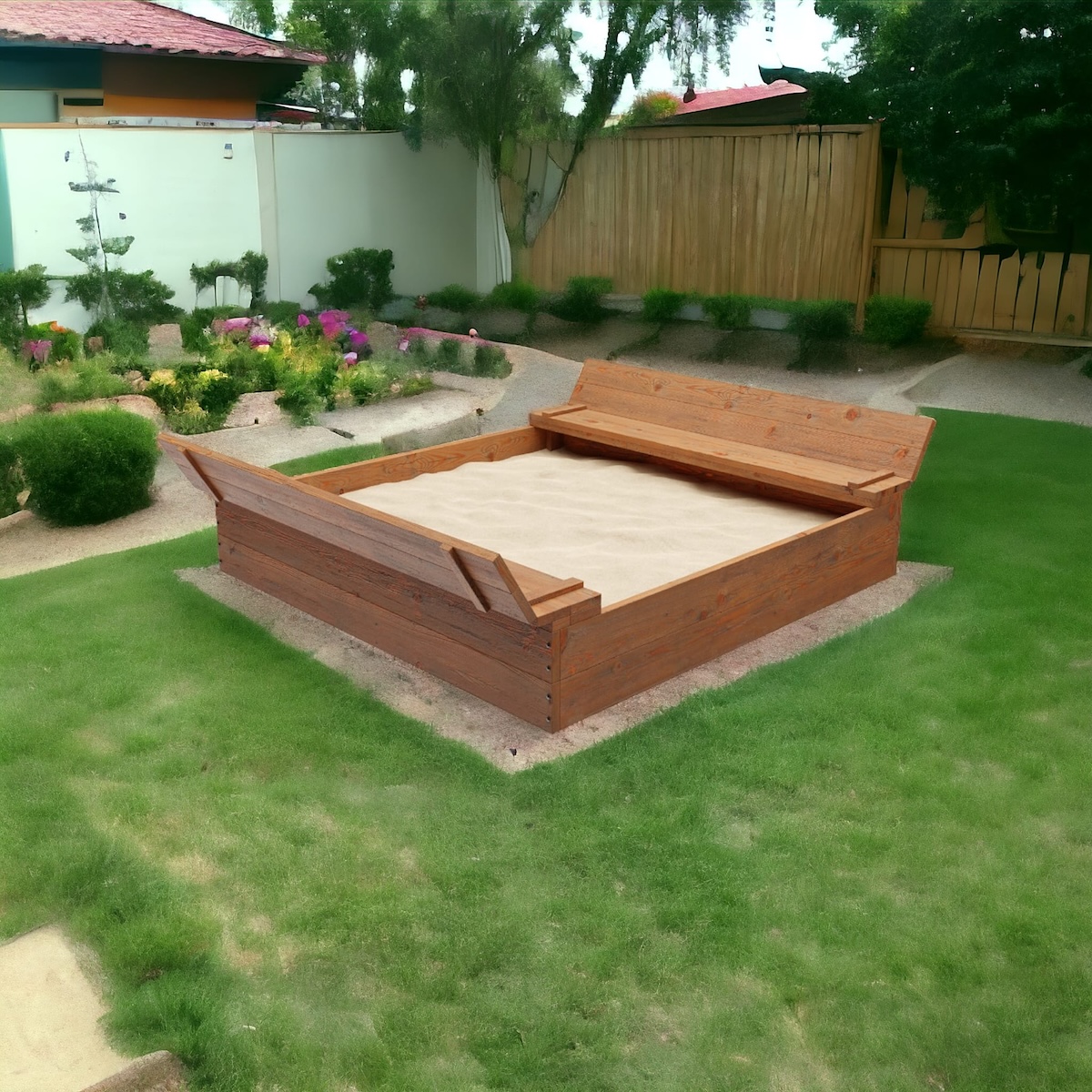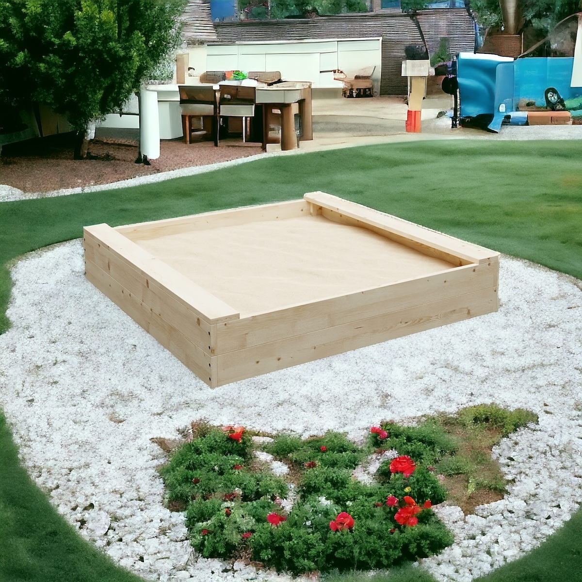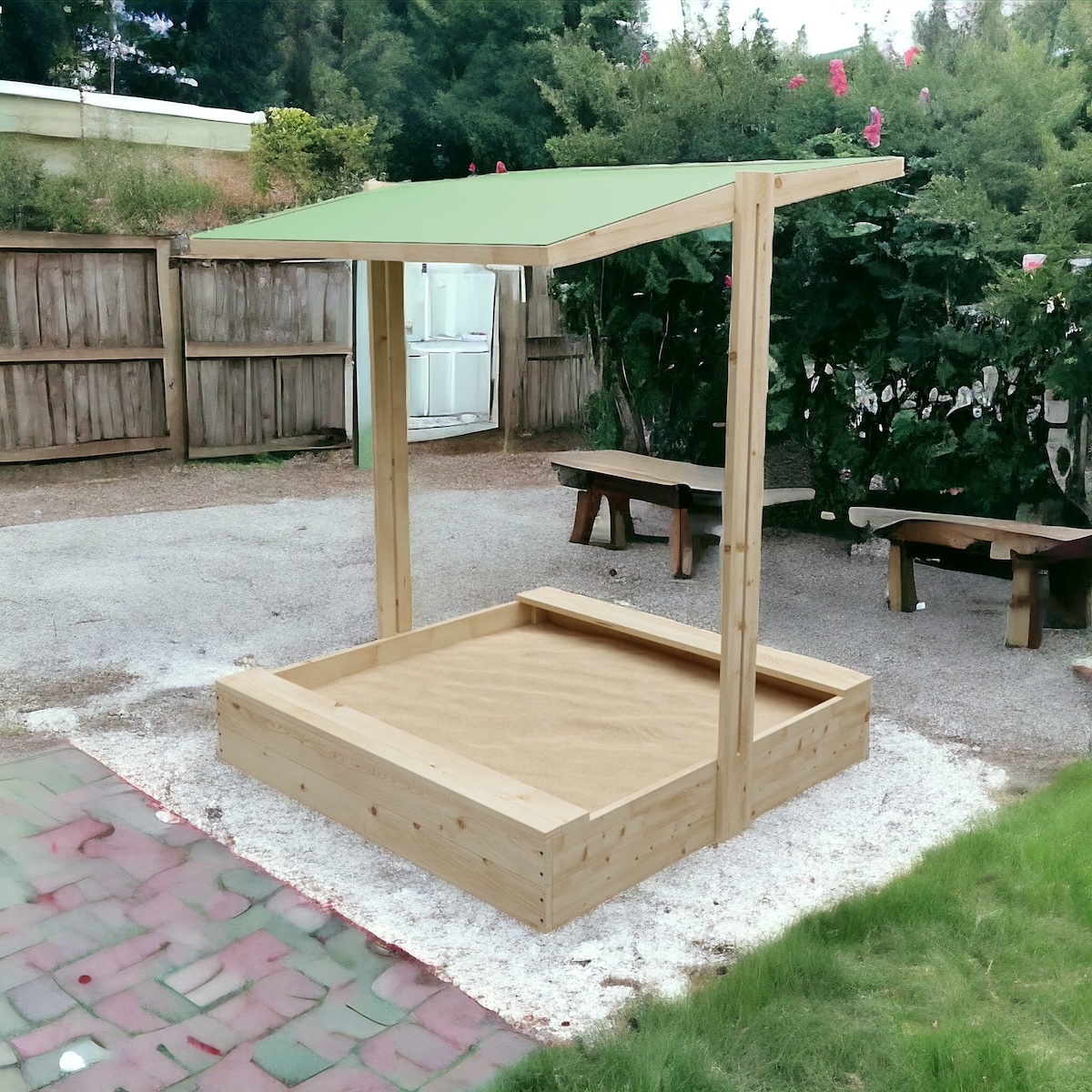 Proměňte svou zahradu v ráj pro děti s naším dřevěným pískovištěm se stříškou. Děti si mohou užívat nekonečné hodiny zábavy při stavění báboviček, kopání tunelů a vytváření pískových hradů. Naše pískoviště je navrženo tak, aby poskytovalo bezpečné a inspirativní prostředí pro rozvoj kreativity a jemné motoriky vašich ratolestí přímo za domem.