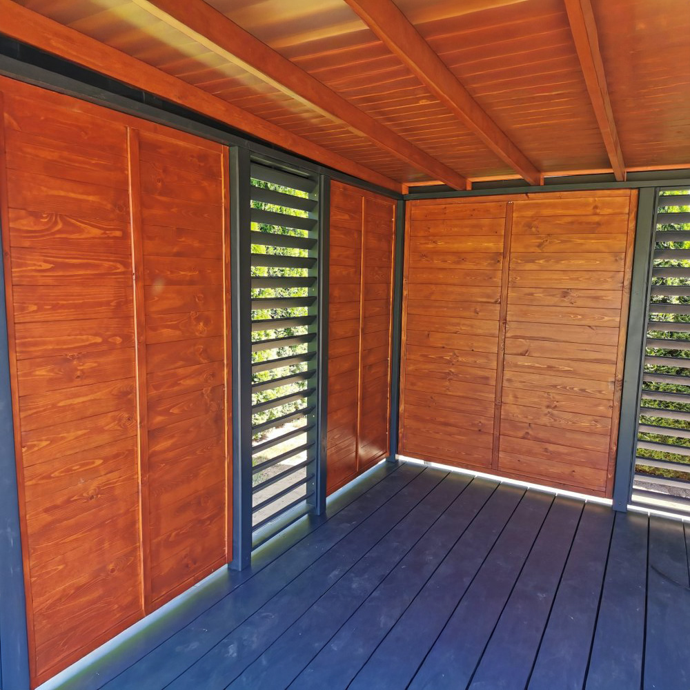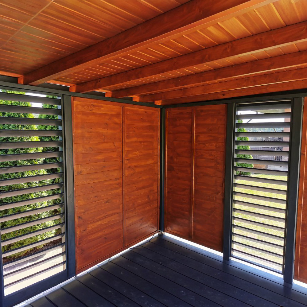 Náš čtyřstranný altán F13 je ztělesněním řemeslné kvality a dlouhé životnosti. Vyrábíme jej z certifikovaného severského smrku, který je známý svou odolností a stabilitou. Nosné sloupy o rozměrech 9x9 cm a obložení s deskami o tloušťce 25 mm v surovém stavu zaručují pevnou a robustní konstrukci. K natření používáme ekologické, vodou ředitelné barvy, které jsou šetrné k životnímu prostředí. S minimální údržbou se životnost našeho altánu počítá na 20-30 let, přičemž potřeba údržby je přibližně jednou za 10 let.