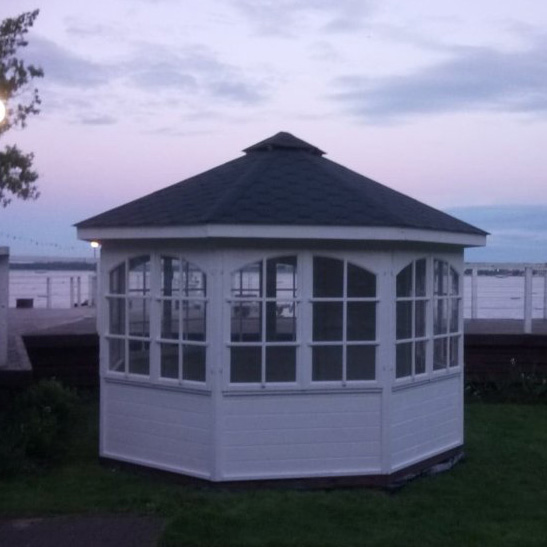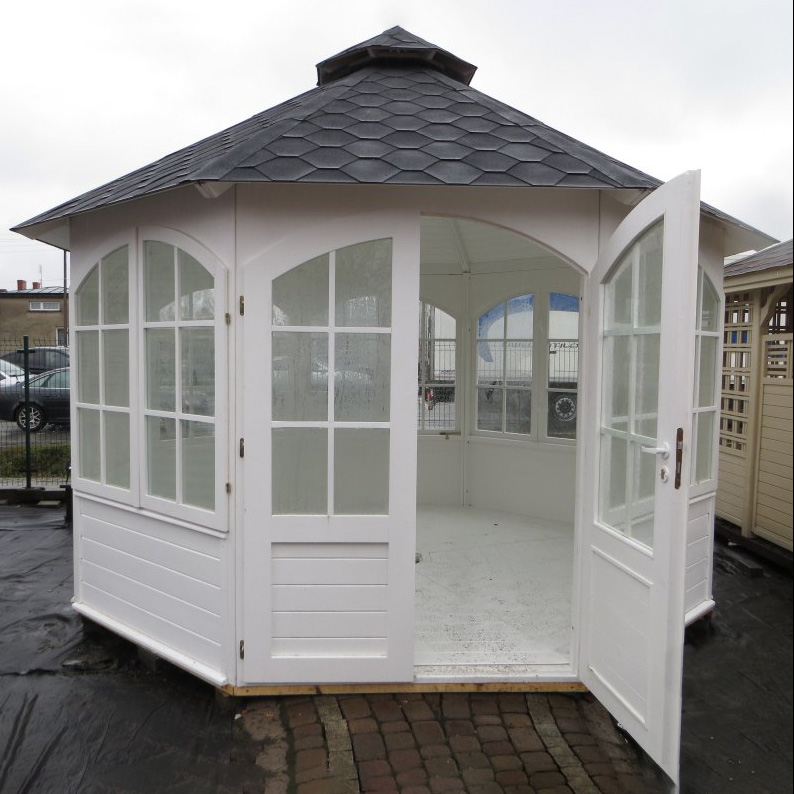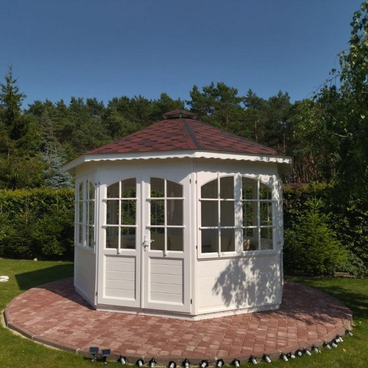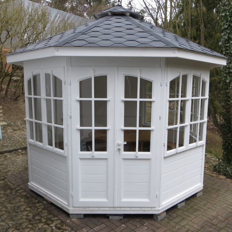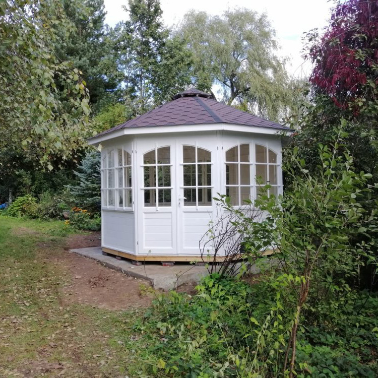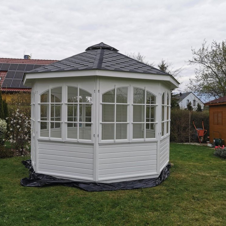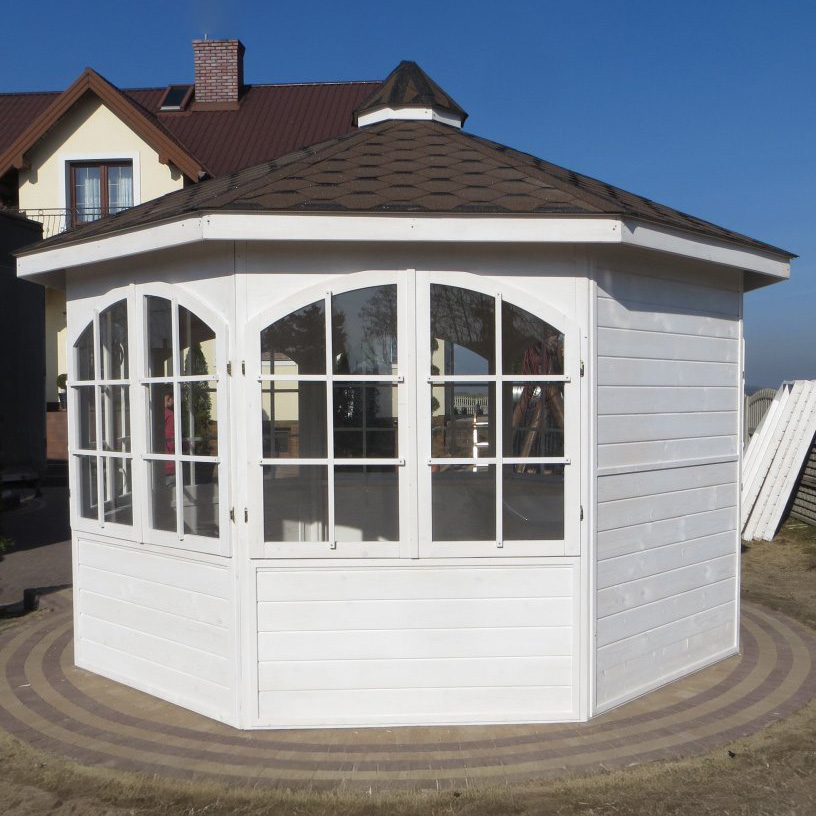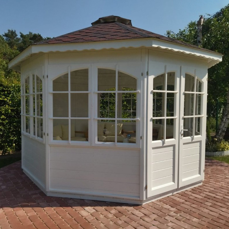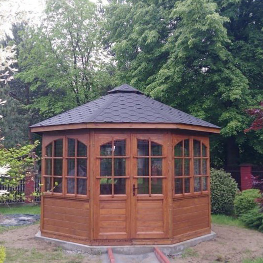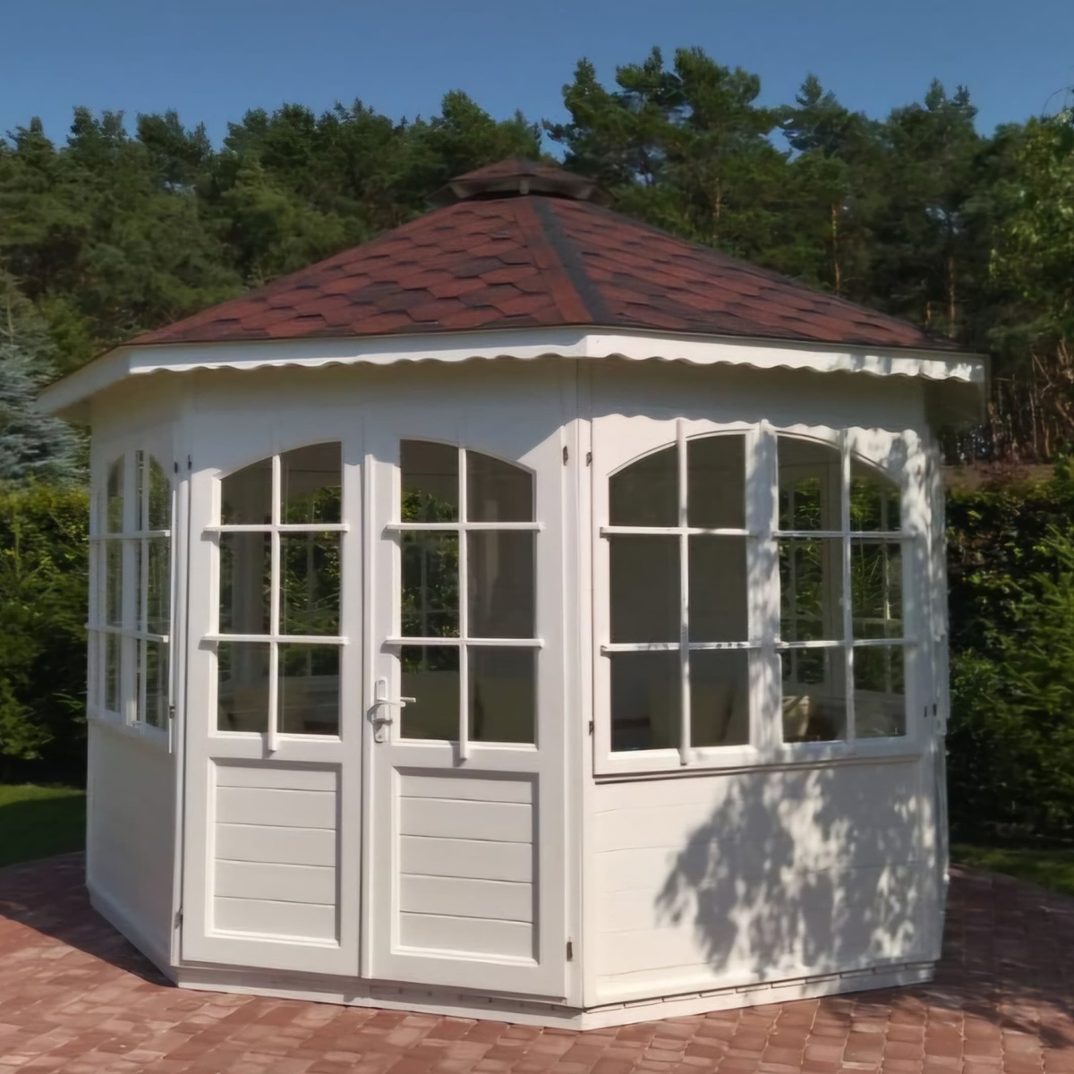- Standardní vybavení: V ceně altánu jsou zahrnuty bitumenové tašky pro pokrytí střechy, kompletní zasklení a praktické dvoukřídlé dveře.