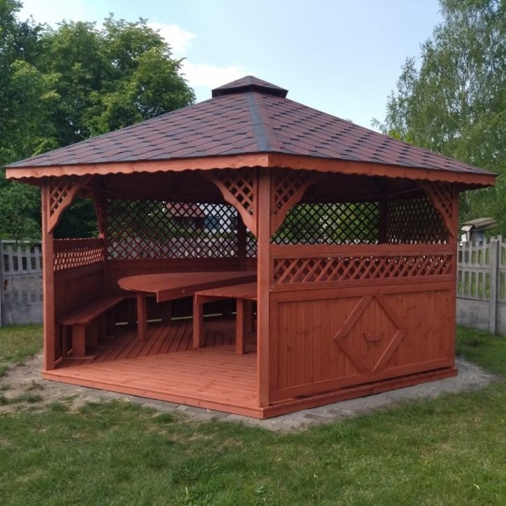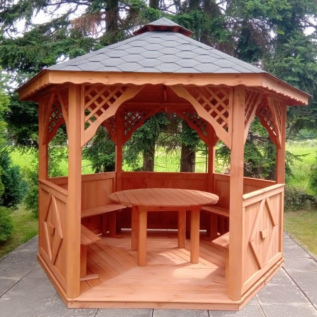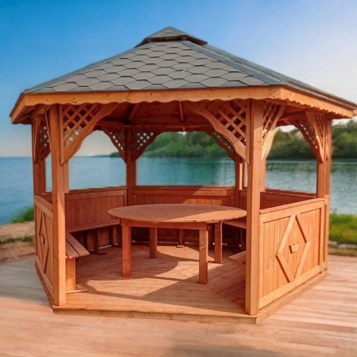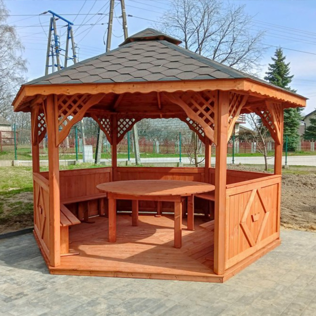 Užijte si chvíle pohody a relaxace ve vašem vlastním Dřevěném altánu šestistranném D3, který je ztělesněním kvality a elegance. Tento altán je vyroben z certifikovaného severského smrku, což zaručuje výjimečnou odolnost a životnost až 20-30 let s minimální údržbou. Většina variant navíc zahrnuje dřevěnou podlahu a kompletní vybavení nábytkem, připravené pro vaše okamžité použití. S neomezenou paletou barev a výběrem střešních šindelů si vytvoříte ideální místo pro setkávání, které dokonale splyne s vaší zahradou.