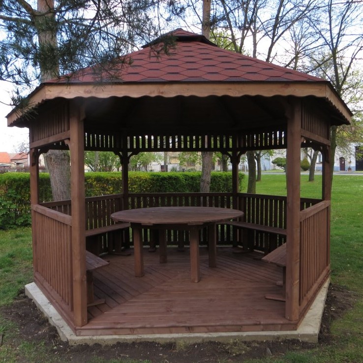 Pořiďte si šestistranný dřevěný altán E4, který je vyroben z certifikovaného severského smrku a zaručuje dlouhou životnost 20-30 let. Tento elegantní altán nabízí široké možnosti barevných úprav a dodává se s bitumenovými taškami na střechu již v ceně. U většiny rozměrů získáte navíc dřevěnou podlahu a nábytek zdarma, což z něj činí ideální místo pro relaxaci a setkávání. Užijte si kvalitu a pohodlí s minimální údržbou.