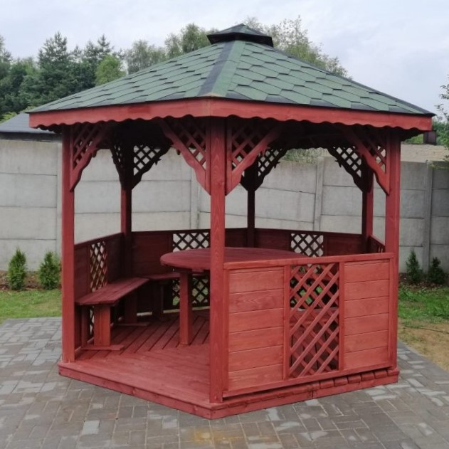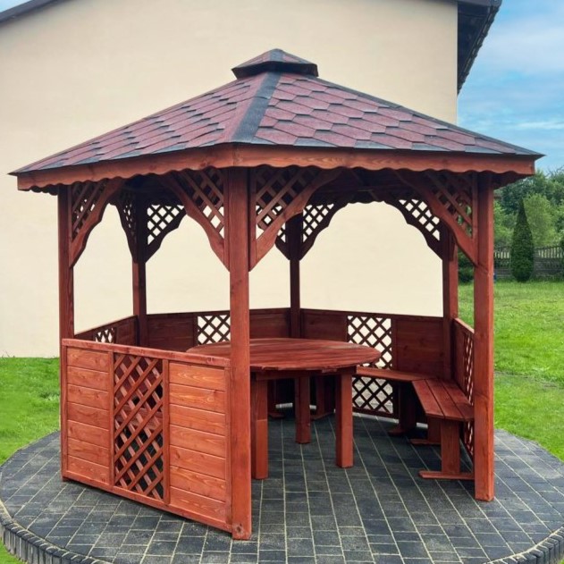 Ano, k tomuto altánu (kromě varianty Ø6m) nabízíme dřevěnou podlahu a nábytek (stůl + 5 volně stojících lavic) ZDARMA.