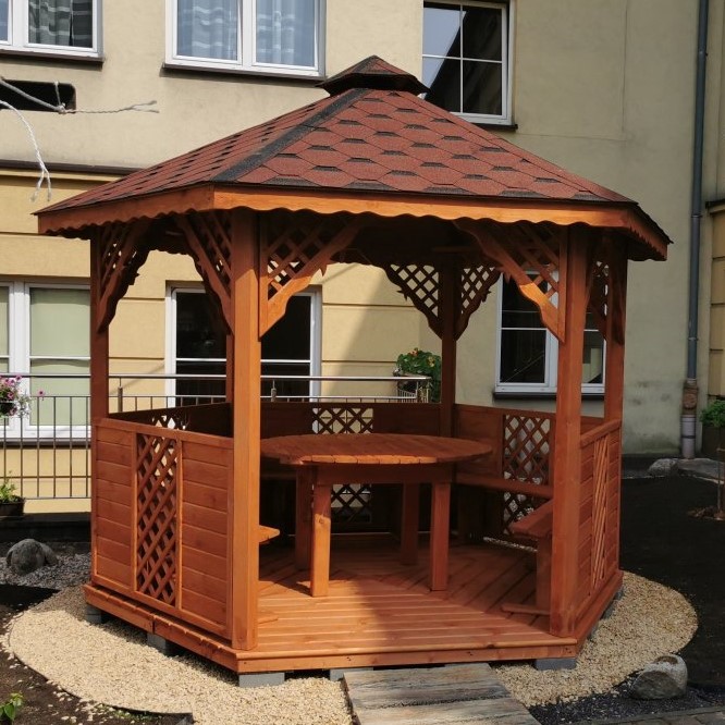 - Podlaha a nábytek zdarma: K tomuto altánu (kromě varianty Ø6m) získáte ZDARMA dřevěnou podlahu a kompletní nábytek, který zahrnuje stůl a pět volně stojících lavic.