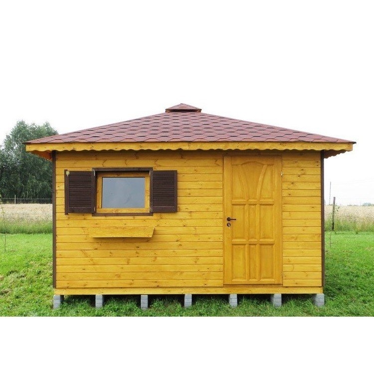 Celková výška domku je 3,05 metru, výška bočních stěn je 2,4m, nosné sloupy jsou vyrobeny z 6×4 až 8x8cm hranolů dle velikosti domu. Obložení a stěny jsou vyrobené z 25mm tlustých desek před sušením a broušením – výsledná palubka má tedy 19-21mm. Terasa se zastřešením je jako varianta výrobku a má 3x2m.