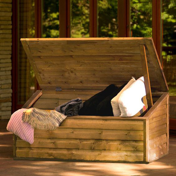 Rozměry dřevěného zahradního úložného boxu jsou 120x63x42/59 cm.