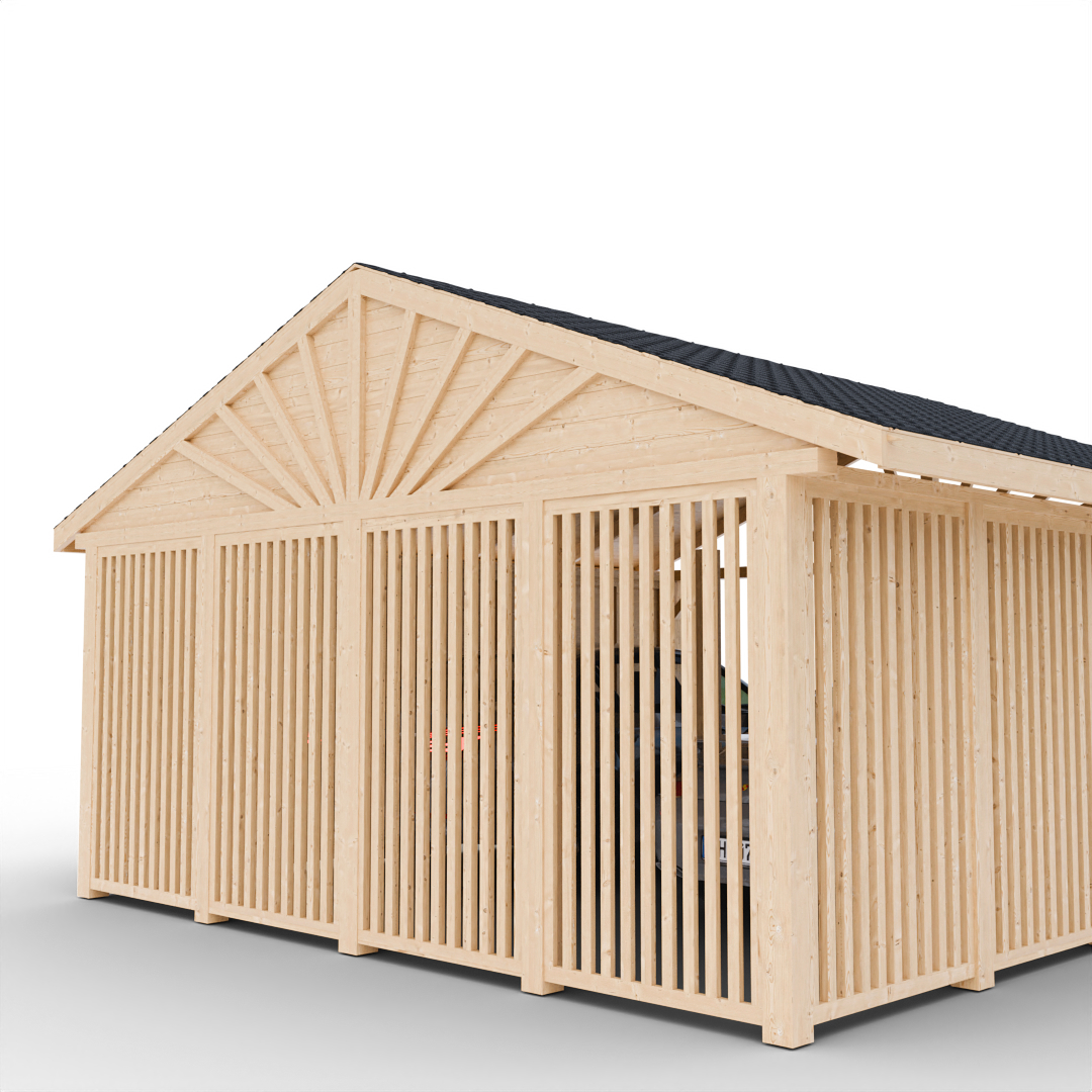 - Typy střešních krytin: Na přání dodáváme různé typy střech, jako je polykarbonát, plechový šindel, plechová střecha, asfaltový pás nebo asfaltový šindel. Pro plechovou tašku je nutný palubkový záklop a sklon střechy 15°.