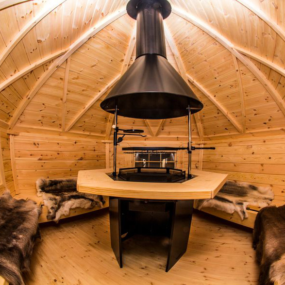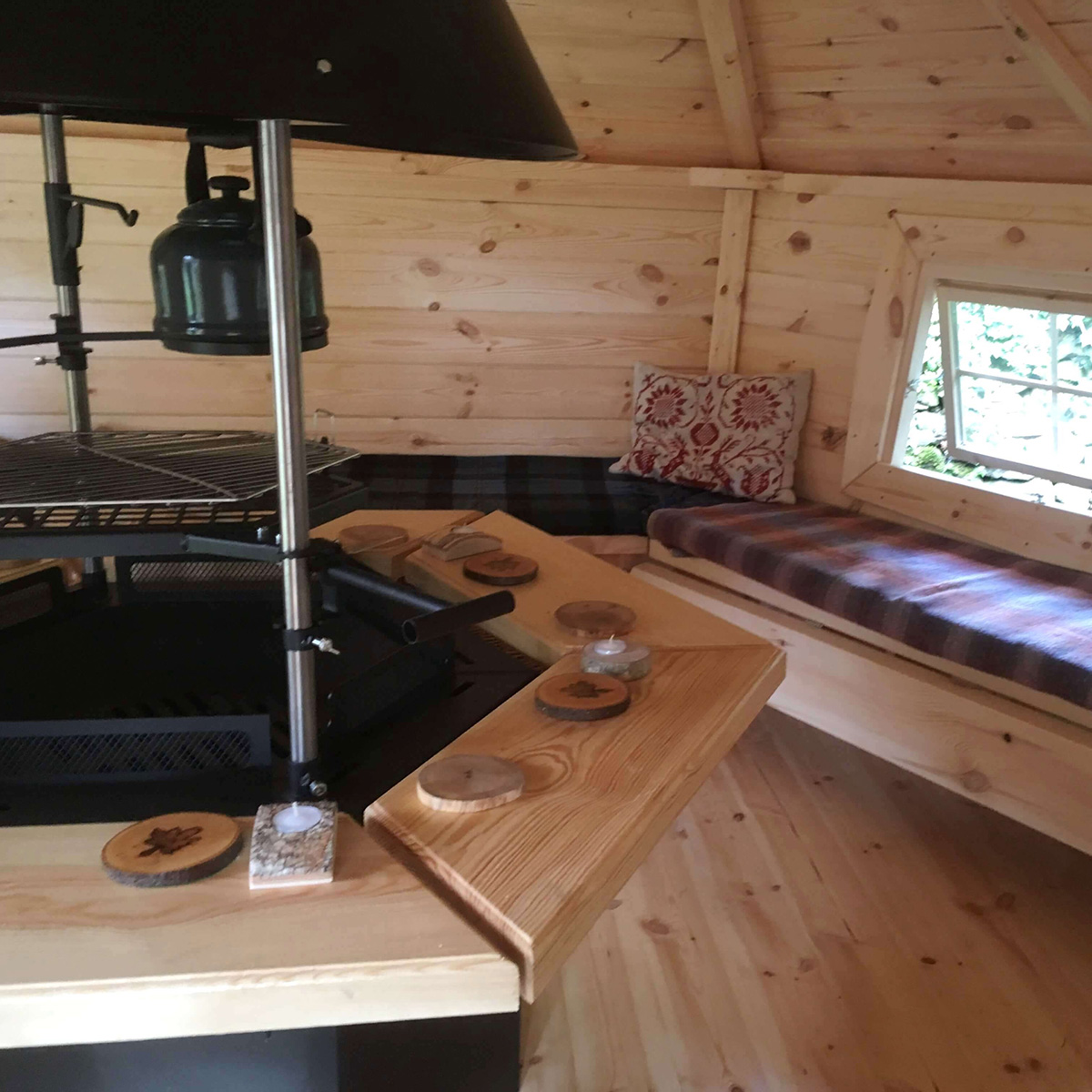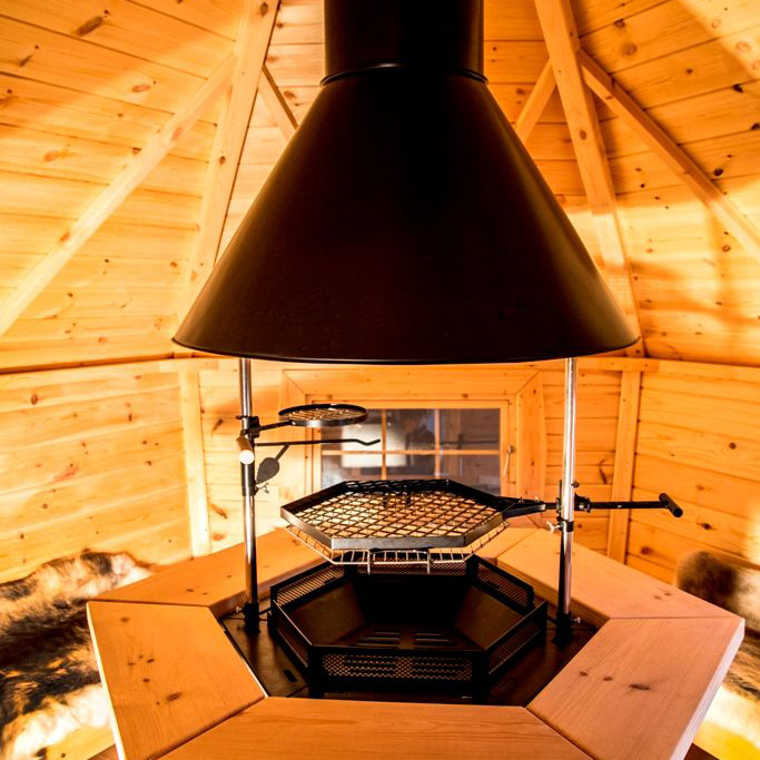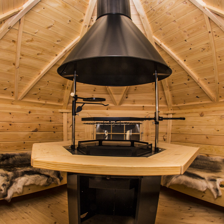 - Centrální luxusní BBQ: Srdce chatky tvoří integrované BBQ s praktickým dřevěným stolem kolem něj, ideální pro grilování a posezení s přáteli.