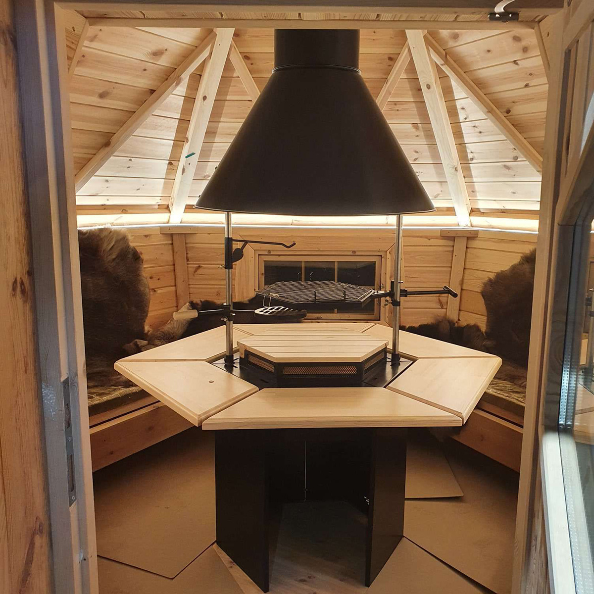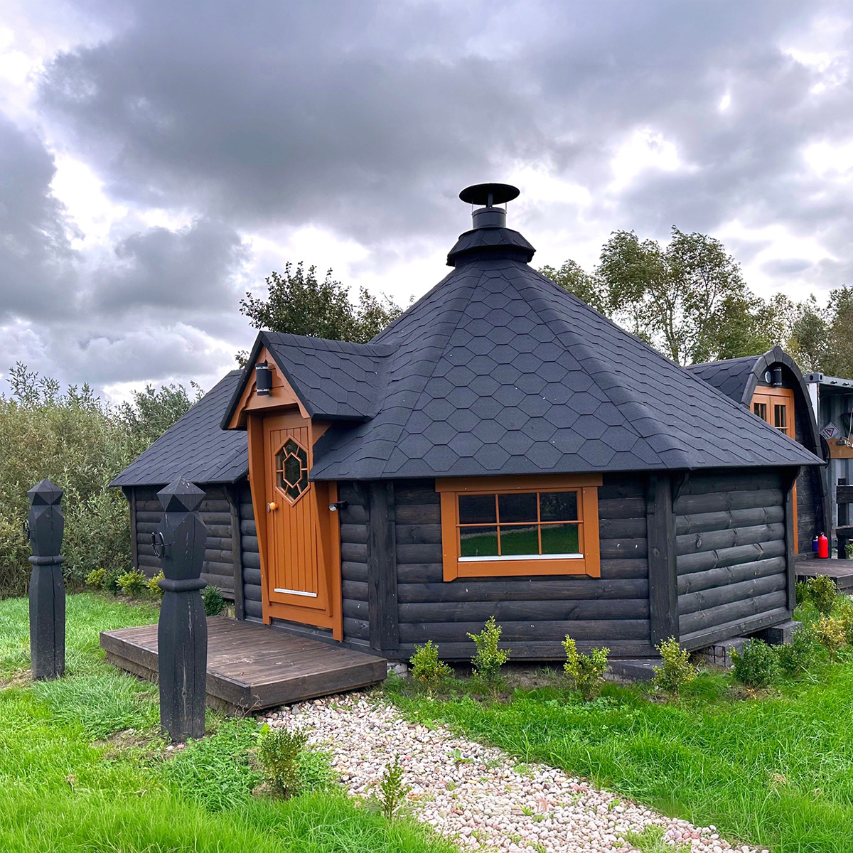 Naše Kempingová grilovací chatka, známá také jako BBQ nebo Hobbit chatka, je inspirována starou skandinávskou tradicí („grillhytte“ – norsky nebo „grillkåta“ – švédsky). Je navržena tak, aby poskytovala úžasný zážitek z venkovního stolování po celý rok, bez ohledu na nepřízeň počasí. Budete ohromeni útulnou a kouzelnou atmosférou, kterou tento jedinečný prostor vytváří.