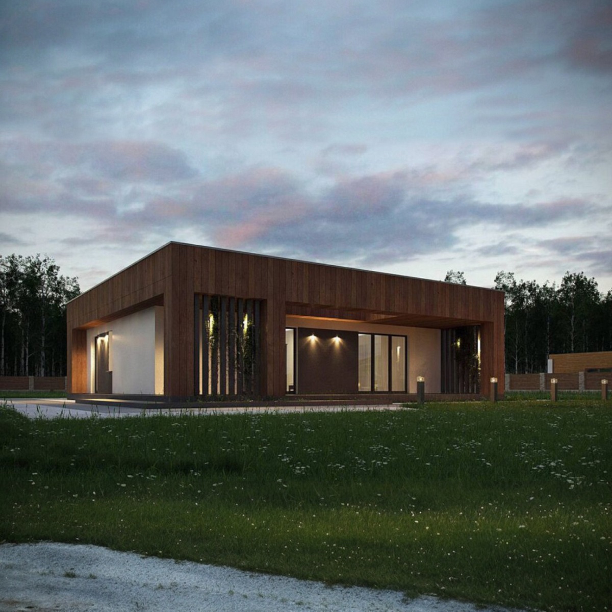 Dům MODERN 76D je přízemní dům s plochou střechou, bez garáže. Má velké prosklené plochy a zastřešení nad vstupní i zahradní částí.