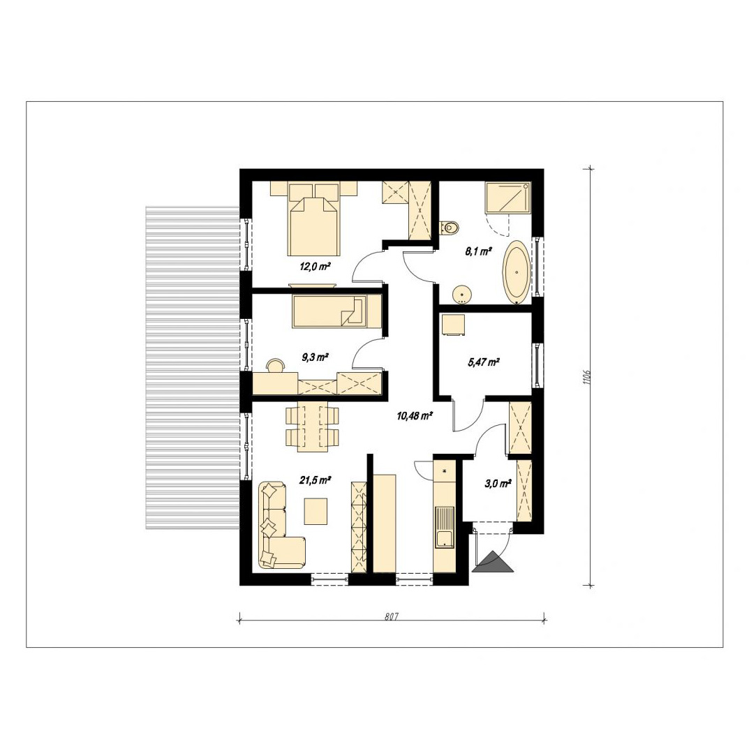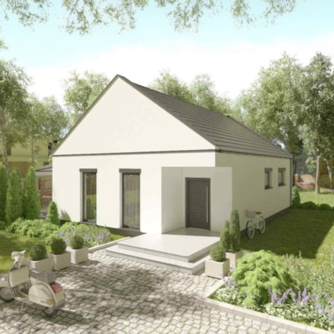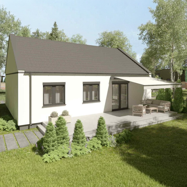Obrovskou výhodou tohoto domu je jeho praktické uspořádání místností, které umožňuje volný pohyb po celém objektu. Prostorný obývací pokoj, který je přímo spojený s prostorným kuchyňským koutem, usnadňuje kontakt a díky dvojitým balkonovým dveřím je přístup na terasu jednoduchý a rychlý. Srdcem domu je dlouhá chodba, která spojuje téměř všechny místnosti. Tři ložnice, koupelna a zádveří s přístavbou hospodářské místnosti poskytují velmi pohodlné podmínky i pro čtyřčlennou rodinu. Boční stěna bez oken umožňuje rozšíření stavby o přístřešek nebo garáž. Konstrukce domu umožňuje montáž schodů a využití podkroví pro obytné účely.
