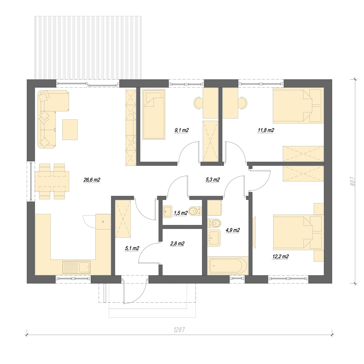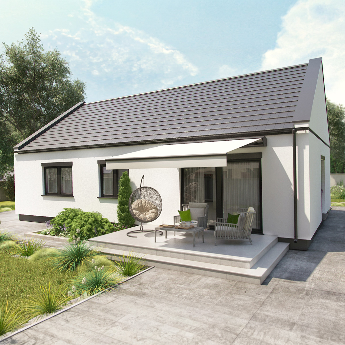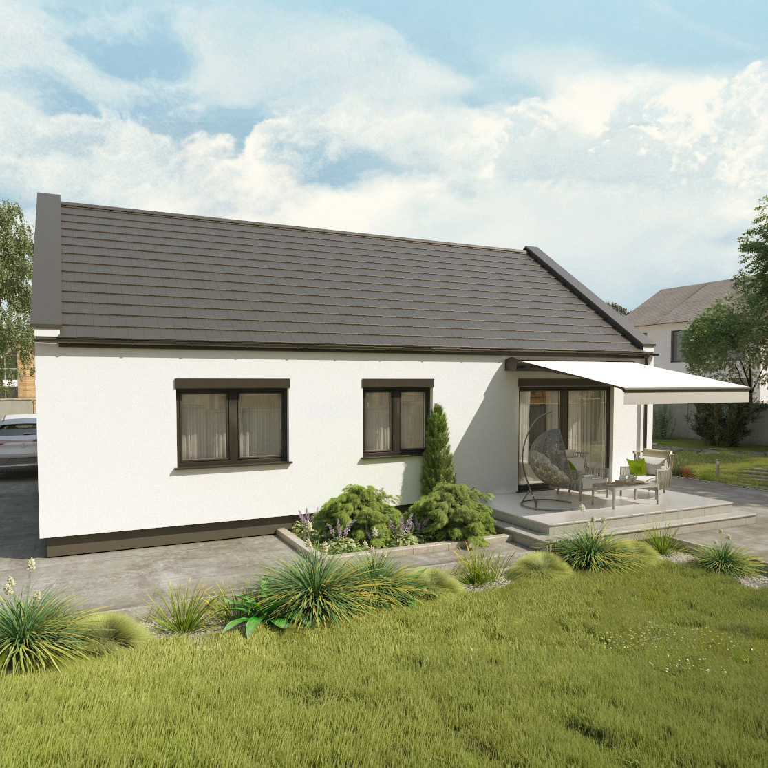 Obrovskou výhodou tohoto domu je jeho praktické uspořádání místností, které umožňuje volný pohyb po celém objektu. Prostorný obývací pokoj, který je přímo spojený s prostorným kuchyňským koutem, usnadňuje kontakt a díky dvojitým balkonovým dveřím je přístup na terasu jednoduchý a rychlý. Srdcem domu je dlouhá chodba, která spojuje téměř všechny místnosti. Tři ložnice, koupelna a zádveří s přístavbou hospodářské místnosti poskytují velmi pohodlné podmínky i pro čtyřčlennou rodinu. Boční stěna bez oken umožňuje rozšíření stavby o přístřešek nebo garáž. Konstrukce domu umožňuje montáž schodů a využití podkroví pro obytné účely.