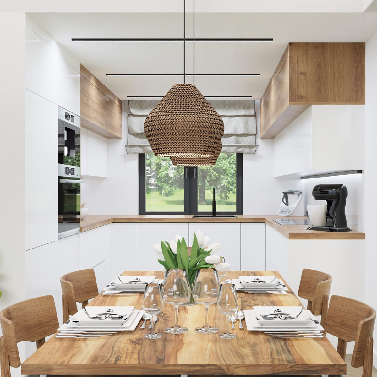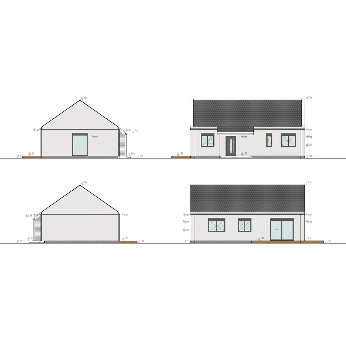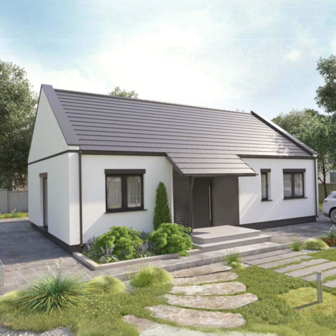 Úhledný, moderní jednopodlažní dům s jednoduchou konstrukcí na obdélníkovém půdorysu.