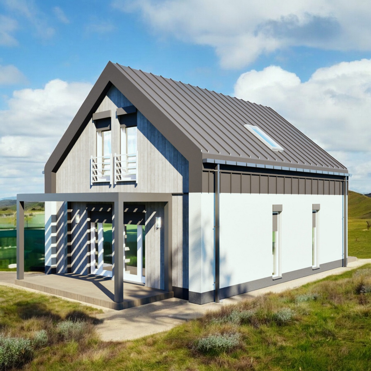 V přízemí se nachází prostorný obývací pokoj propojený s kuchyňským koutem, který usnadňuje integraci členů domácnosti a vytváří pohodlný obytný prostor. Praktické zádveří, dvě ložnice a koupelna poskytují pohodlí a soukromí pro každého obyvatele. Dispozice místností byla navržena s ohledem na optimální využití prostoru, díky čemuž je dům funkční a pohodlný i pro větší rodinu. V podkroví jsou další dva pokoje a druhá koupelna, což zvyšuje komfort užívání domu a umožňuje flexibilní uspořádání prostoru. Velká střešní okna přivádějí světlo do místností a dodávají jim útulný a moderní charakter.