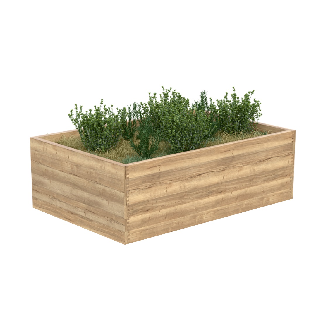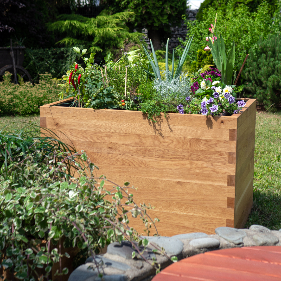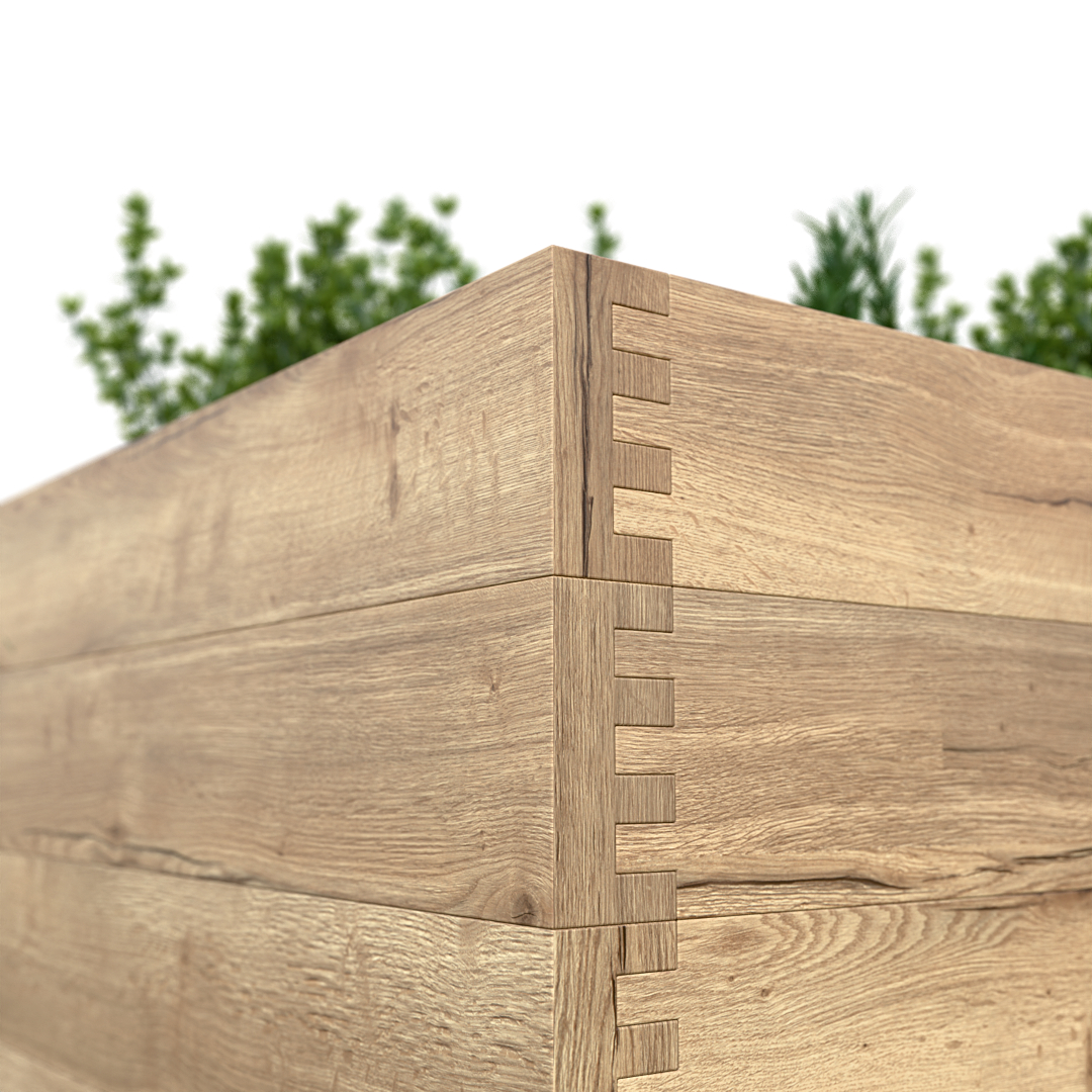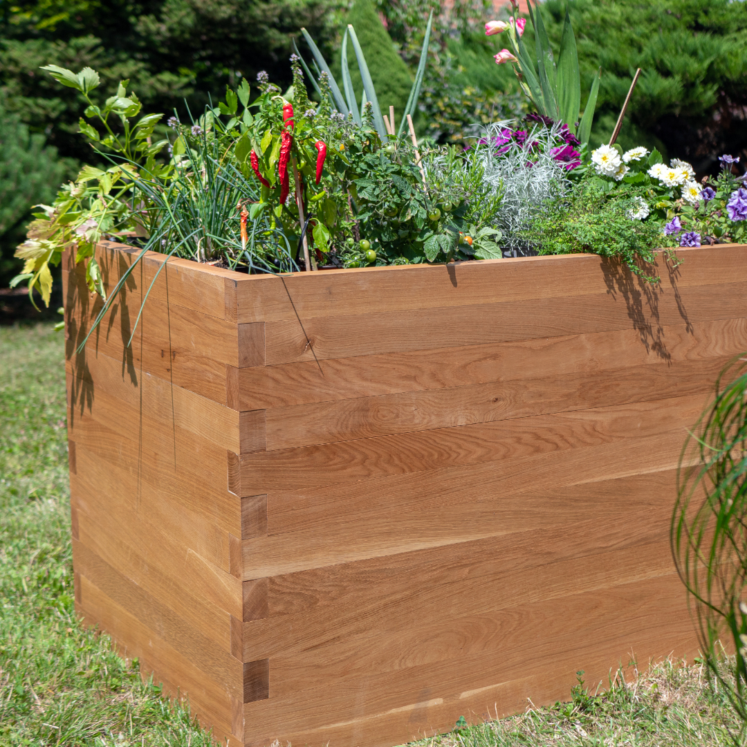 Představujeme Nízký vyvýšený záhon DUB, klenot pro každou zahradu, terasu či balkon. Tento záhon je ručně vyroben z masivních dubových hranolů o rozměrech 65×28 mm, které jsou v rozích precizně propojeny přeplátováním. Dub je jako materiál pro venkovní použití skutečně luxusní volbou, a to především díky své neuvěřitelné životnosti, která se udává i bez údržby na 100 let a více.