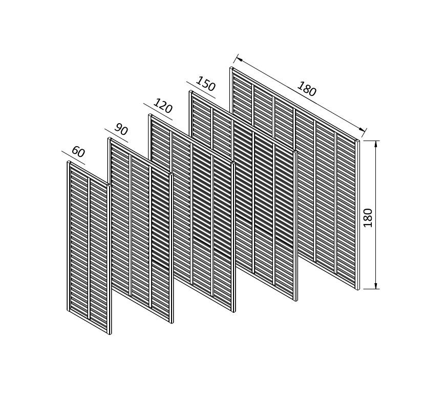 Rozměry jednotlivých částí: rám 30 x 40 mm, latě 40 x 8 mm, mezera mezi latěmi 19 mm.