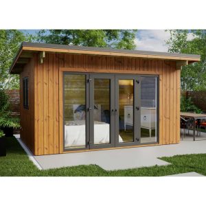 Exteriér hybridní srubové chaty je navržen s důrazem na estetiku i odolnost. Tři boční stěny jsou opatřeny elegantním ocelovým obložením, které vytváří moderní, bezúdržbovou fasádu. Stěny jsou pokryty t borovicovým obkladem a může být zaměněn za doplatek za tepelně upravenou borovici Thermowood. //Thermowood | Stolárna na statku s.r.o.//