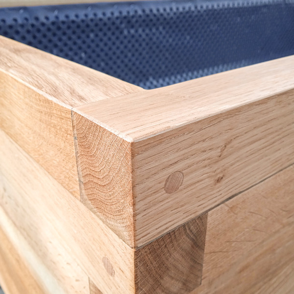 Kolekce Dub je vyrobena z masivních dubových hranolů o rozměrech 70x45 mm. Hranoly jsou co 25 cm propojeny podlepenými dřevěnými kolíky, které zabraňují zkrutu materiálu. Dub je jako materiál pro venkovní dřevěné květináče a záhony výjimečnou a skutečně luxusní volbou a to zejména díky své životnosti, která se udává i bez údržby 100 let a více. Hlavní výhodou tohoto záhonu je také minimalistická bezrámová konstrukce, hranoly jsou přitom propojeny v rozích přeplátováním. Záhon Dub nabízíme pouze v přírodní variantě, namořený v transparentním oleji.
